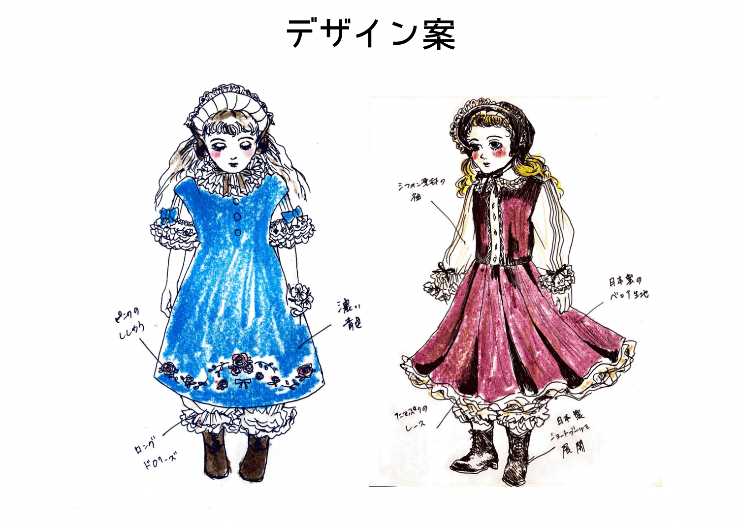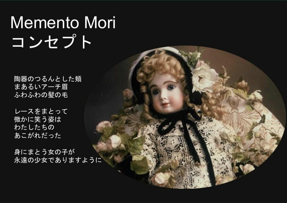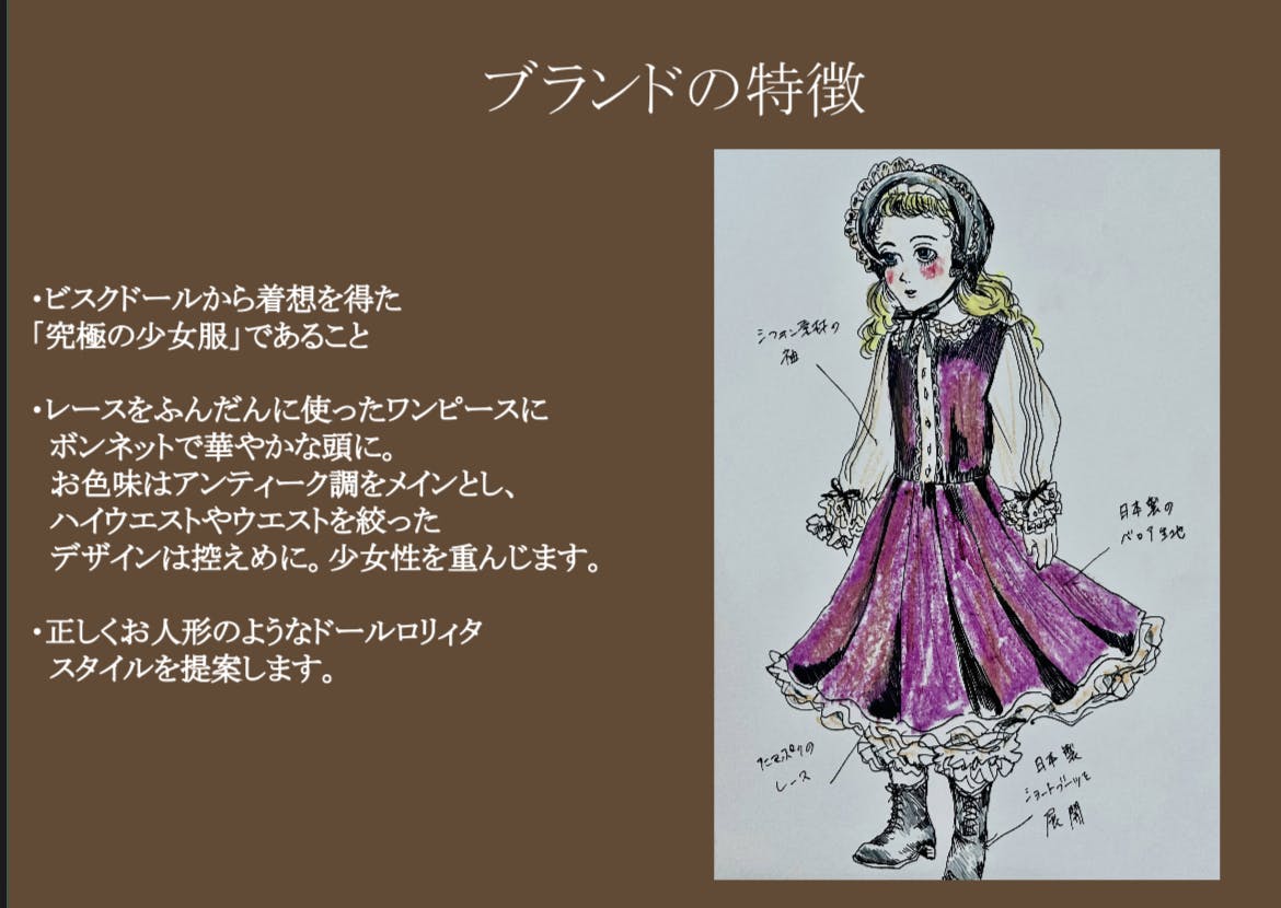 わたしが考え理想とする究極のロリィタファッションとは、お人形です。西洋のビスクドールのメイク、ヘアスタイル、シルエット。すべてが少女性を追求したものです。そこに日本製の良さを加えます。日本製であると日本人のサイズ感によく合い、日本の生地とミシンの相性も良く、素晴らしい仕上がりになると考えます。ありそうでなかったドールロリィタファッションというものを掲げ、新しいロリィタスタイルを作り上げ提案したいです。