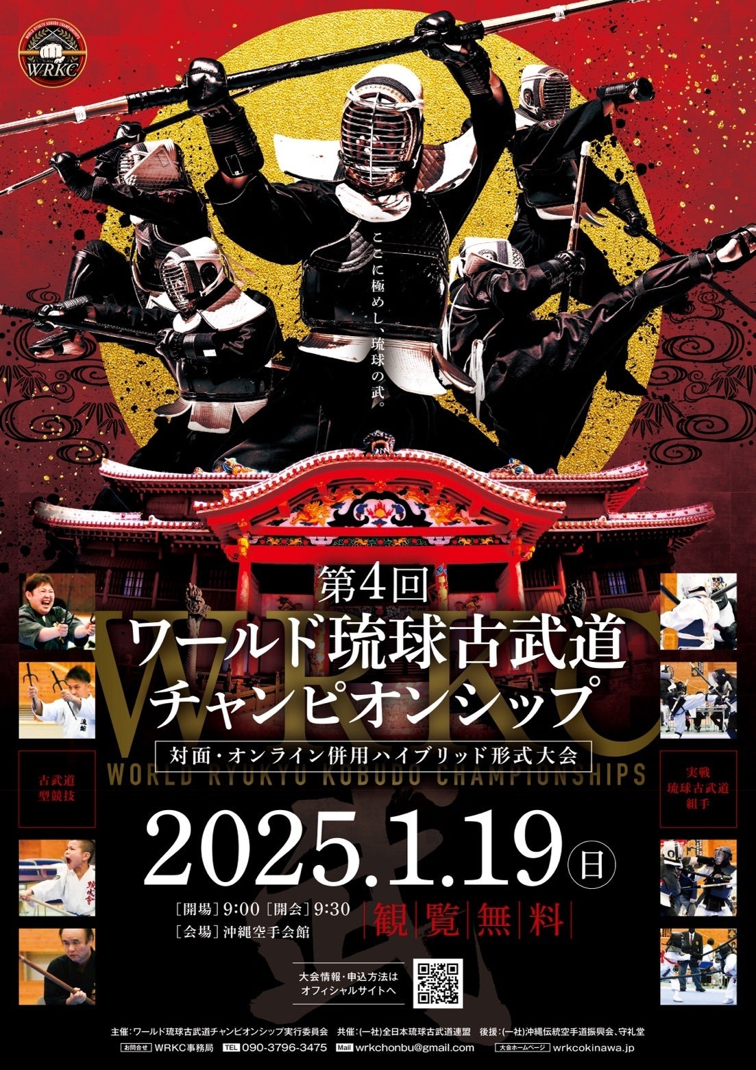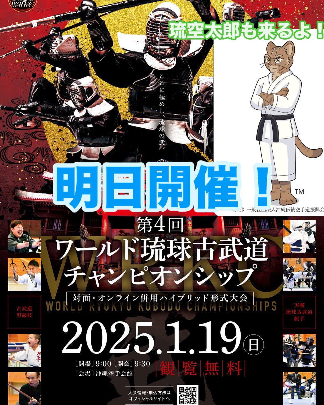 2025/01/18 11:30**第4回ワールド琉球古武道チャンピオンシップのお知らせ** 明日、1月19日(日)、待望の第4回ワールド琉球古武道チャンピオンシップが開催されます!**日時:** 2025年1月19日(日)**場所:** 沖縄空手会館 **参加者数:** 全体で200人、対面72人、オンライン128人、そして22ヵ国から80名が参加! お昼には空手古武道の演武も行います。琉空太郎と共に普及型Ⅰ.Ⅲを演武する機会もあり、一般参加も大歓迎です! **競技内容:** - 型(棒/釵)子供〜シニア各9クラス- 組手(実戦琉球古武道)軟式5クラス/硬式2クラス- オンライン型(棒/釵)子供〜一般各6クラス 硬式組手には県外の選手やキックボクシング、他の武術家も参加します!実戦琉球古武道を追求した迫力ある試合をお楽しみに!大会後はYouTubeで大会の動画を配信予定です!オンライン結果発表は明日12時に行いますので、ぜひチェックしてください! ➡Https://www.youtube.com/@wrkcwrkcsecretariat8454 **観覧は無料!** 皆さまのご来場を心よりお待ちしております! もっと見る