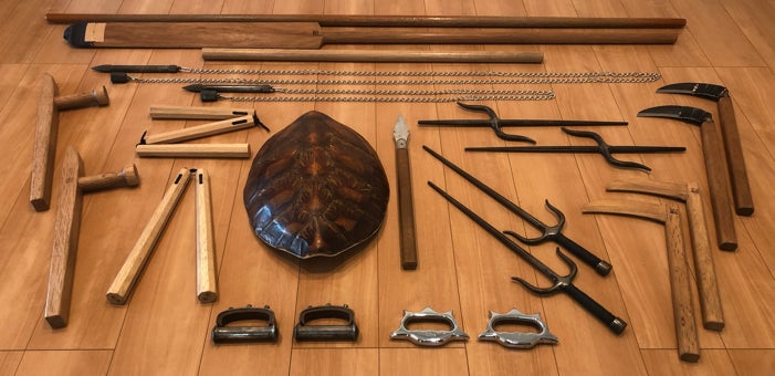 琉球古武道武具 棒・エーク・スルチン・鎌・釵・卍釵・鉄甲・ローチン・ティンベー・ヌンチャク・三節ヌンチャク・トンファーなど