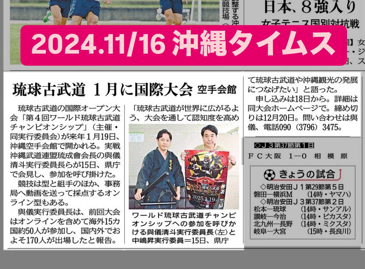 11/16(土)沖縄タイムスにて大会告知記事、第4回WRKC琉球古武道オープン世界大会、ウェブ申込11/18〜12/20.観覧無料!企業協賛、クラウドファンディング募集中!お問い合わせ下さい!多くのご参加お待ちしてます!