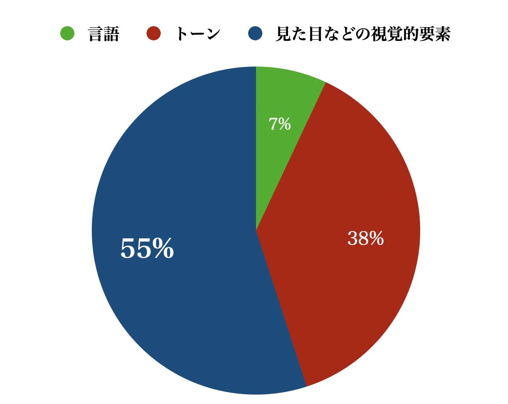 メラビアンの法則:視覚55%、声のトーン38%、言語7%。見た目が圧倒的に重要!