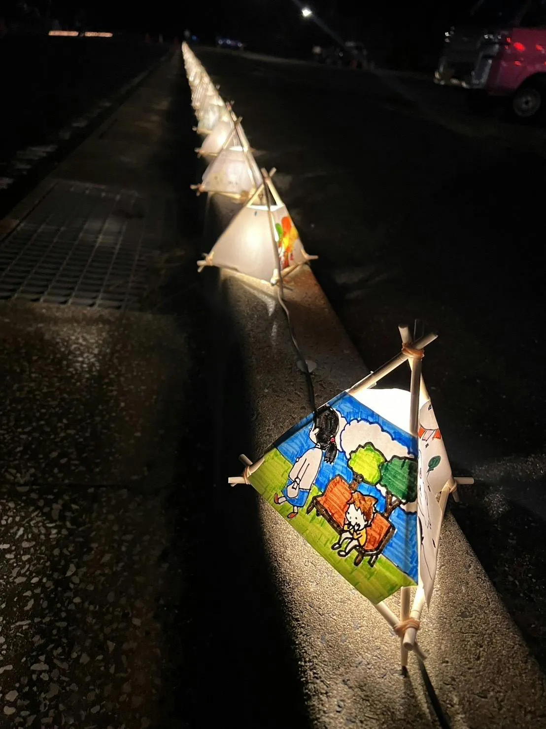 実際に荒天で中止となってしまった2024年10月の開催に向け、壱岐島内の託児所などで沢山の方に紙で出来た灯籠にイラストを描いてもらい200個を超える数の紙灯籠を作成しました。当日の会場で飾り付け、イベント終了時帰り道にライトアップさせていただきます。