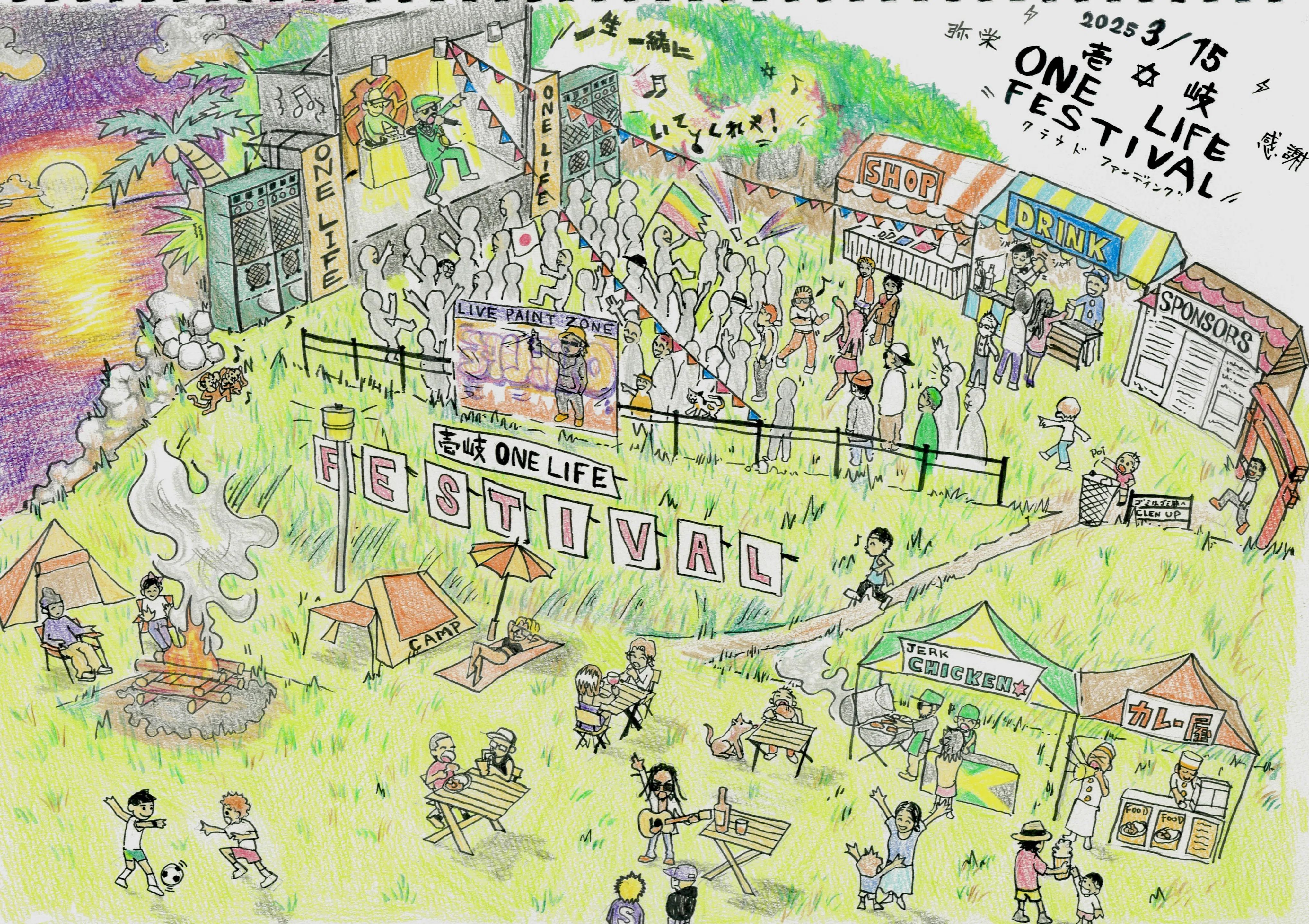 私は長崎県に浮かぶ小さな離島「壱岐」でミュージシャンとして活動しています。かつてにはCAMPFIREのクラウドファンディングでミニアルバム「KOKOKARA」をリリースさせて頂きました。この度、壱岐島を愛しその力を信じる仲間達とONE ENTERTAINMENT(ワンエンターテイメント)を立ち上げ、壱岐島の大自然の中での野外フェスの開催に取り組んでいます。