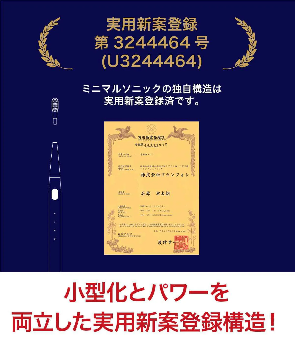 これだけのパワーを小さなボディに収めるために独自の特殊設計を行いました。今までの電動歯ブラシとはまったく異なる構造にすることでようやく実現!