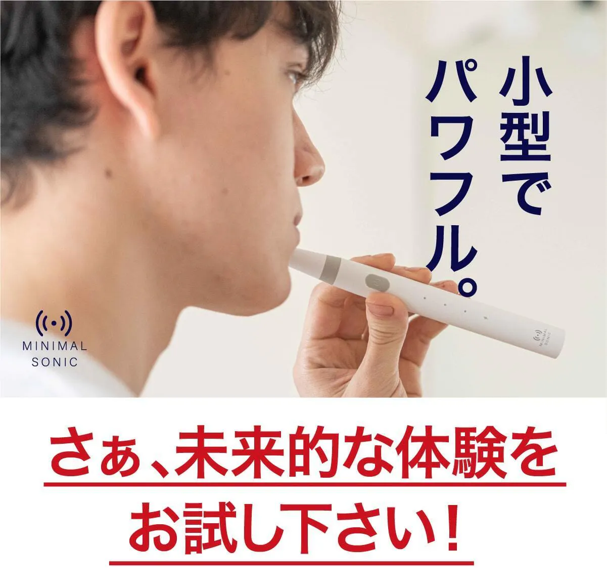 今までの電動歯ブラシを大きいと感じたことはありませんか?普通の歯ブラシから電動歯ブラシに変えた時にそれを大きく感じると思います。電動歯ブラシは構造上、大型化してしまうのですが、常識に囚われずまったく新しい電動歯ブラシを設計したのがこのミニマルソニックです。新発想の構造で小型でパワフル。未来の体験をはじめましょう。