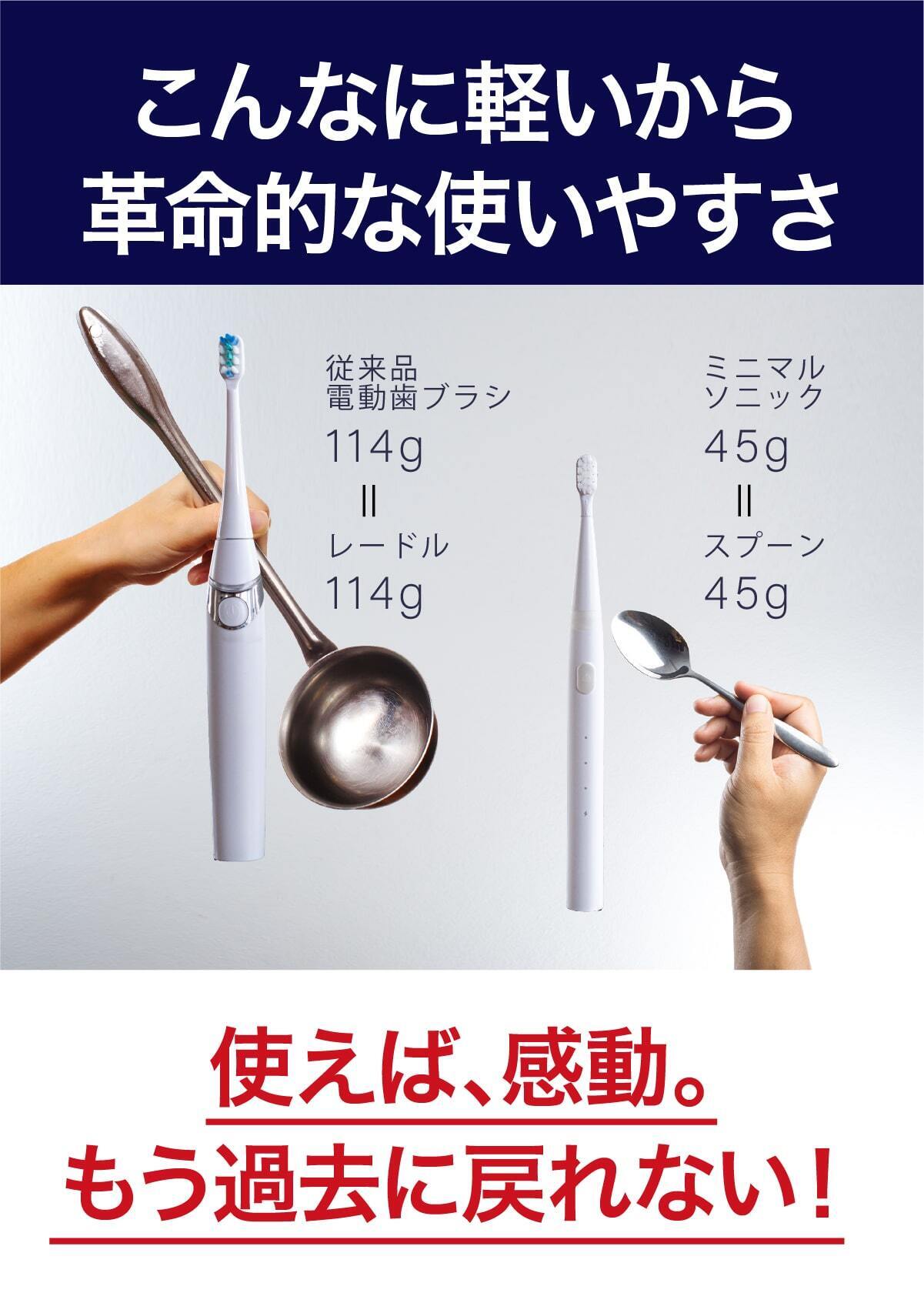 レードル(おたま)の重量は114g、これは従来の電動歯ブラシと同じです。スプーンの重量は45g、これがミニマルソニックと同じです。こんなに軽いから革命的な使いやすさを実現しました。