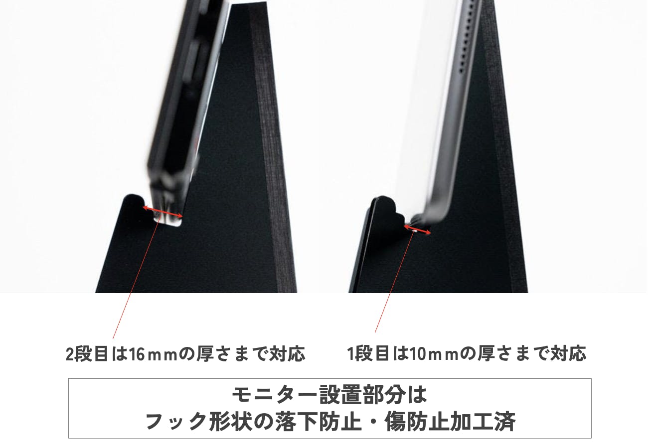 段差設計でモニターをしっかりホールド。10mm〜16mmの厚さのモニターに対応します。