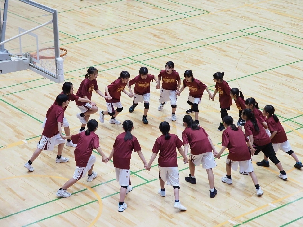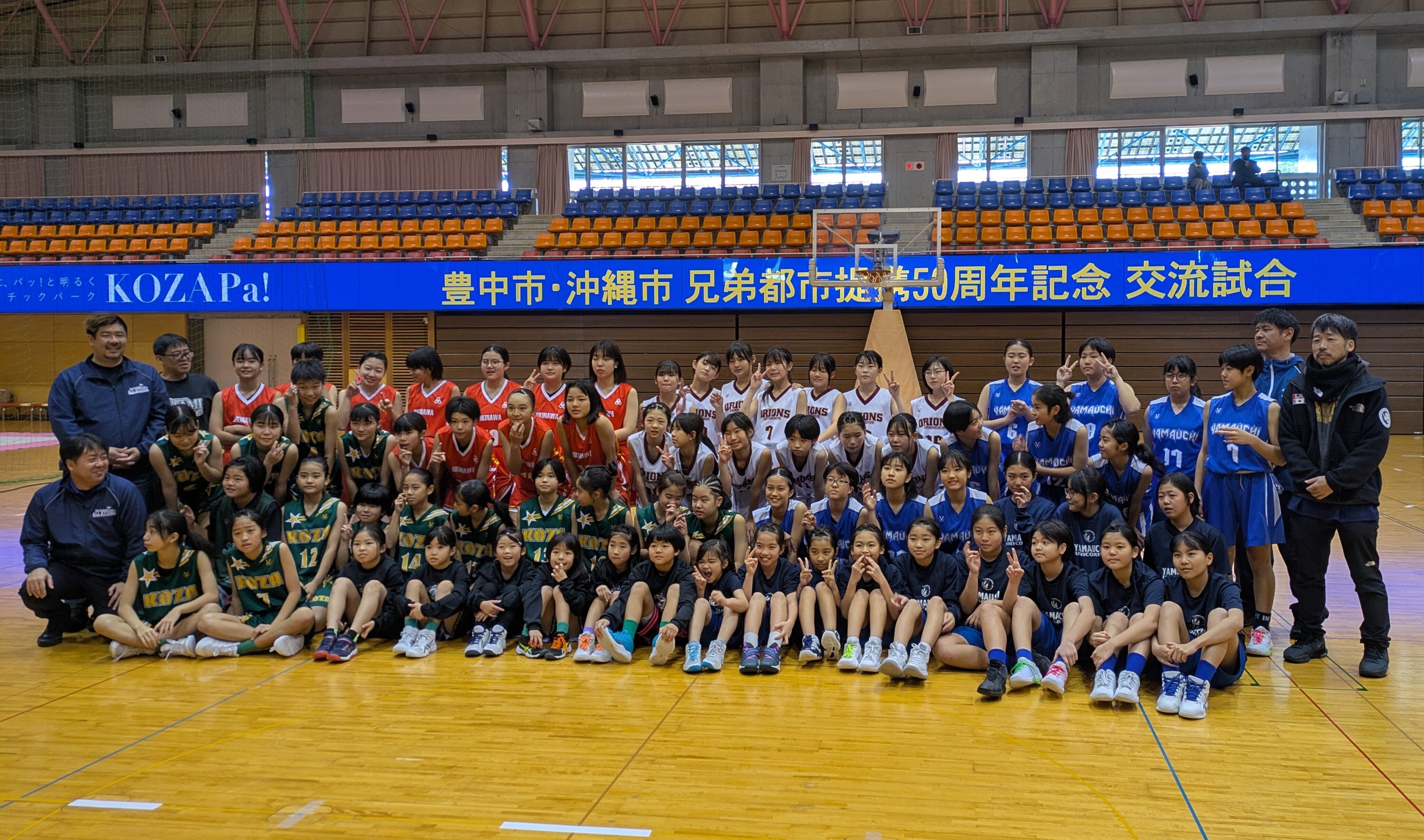 沖縄アリーナでの交流試合の当日、豊中のチーム『千里中央オリオンズ』は、朝一番の飛行機で沖縄入りする予定が、数年に一度の大寒波の影響で出発が大幅に遅れてしまい、残念ながら試合の開始時間に間に合いませんでした。B.リーグの試合開始にはなんとか到着することが出来て、対戦するはずだった沖縄市選抜チームのメンバーと一緒に観戦、試合後にはコートに降りて全員で記念撮影をしました。沖縄アリーナのコートで試合をすることを楽しみしていた豊中の子たちは、きっと悔いがあったと思いますが、そこはバスケを頑張っているからなのでしょう、きっちり切り替えて沖縄こどもの国での兄弟都市の学習会では積極的に取り組んでくれていました。2日目は沖縄市体育館で沖縄市選抜チーム、山内小、コザ小の3チームと時間が許す限り試合をします。
