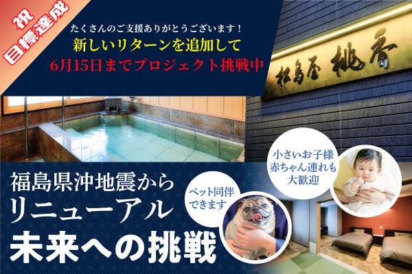 2025/06/16 21:362025年6月15日をもちまして、松島屋旅舘のクラウドファンディングが終了いたしました。最終的に、目標金額300万円に対して、4,082,500円ものご支援をお寄せいただきました。たくさんの応援、本当にありがとうございました。プロジェクトを立ち上げた当初は不安もありましたが、多くの方々から寄せられたご支援やメッセージのおかげで、こうして大きな目標を超える形で終えることができました。皆さまのあたたかい想いをしっかりと受け止め、松島屋 桃香として、また訪れていただける場所をつくってまいります。なお、リターンのお届けや個別のご連絡については、今後順次対応させていただきます。クラウドファンディングはここで一区切りとなりますが、再出発はここからが本番です。今後とも、どうぞよろしくお願いいたします。 もっと見る【最終日】感謝とともに、次の一歩へ