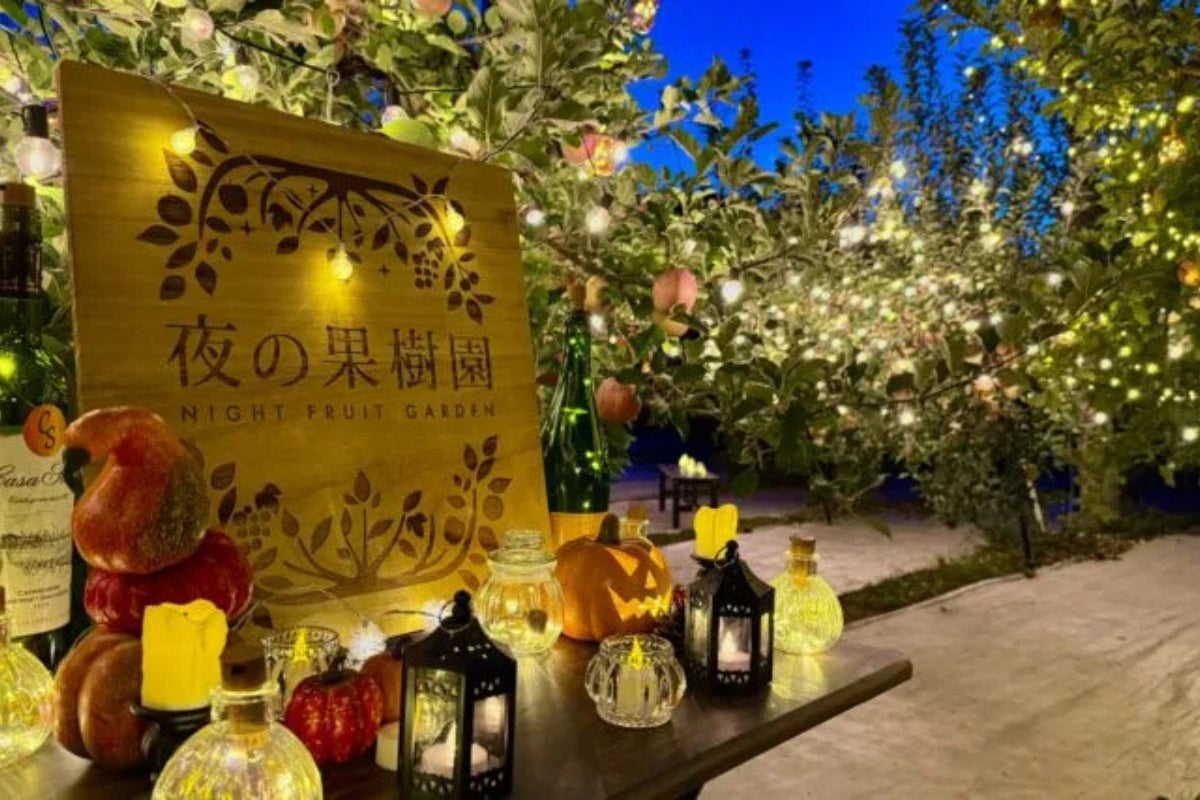 ライトアップされた夜の果樹園福島市にある「まるせい果樹園」さんとのタイアップ企画になります。