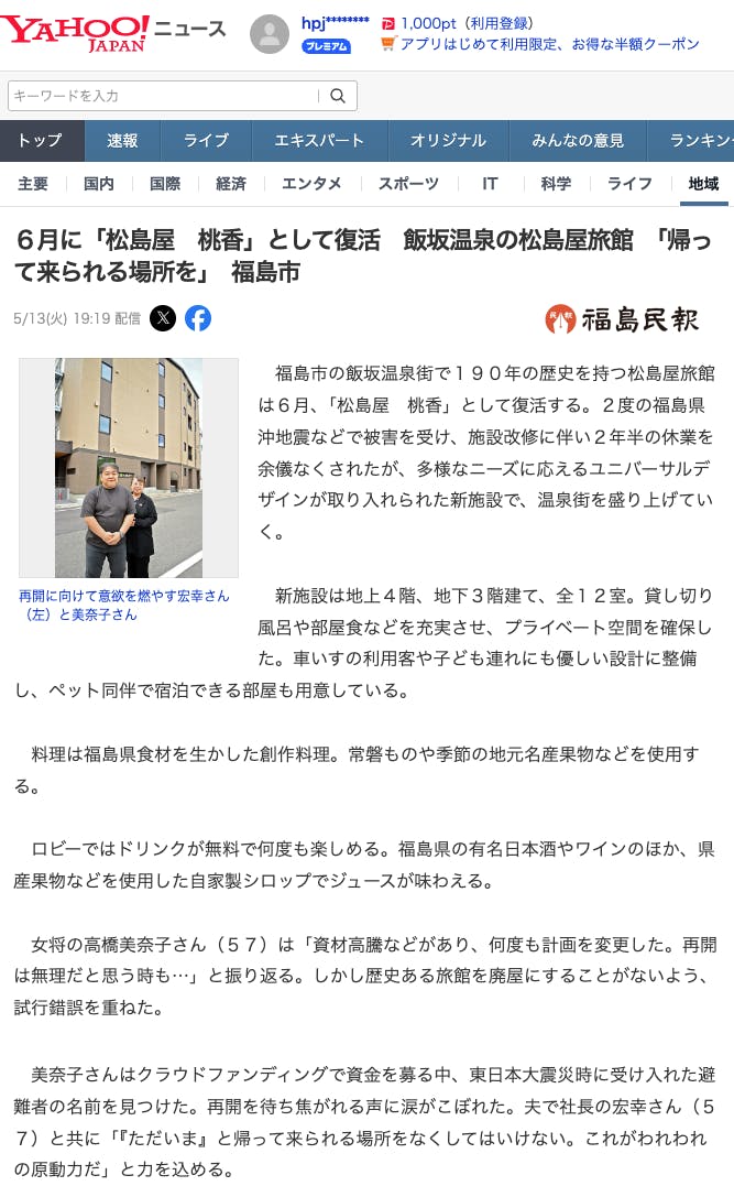 皆さまからの応援のおかげで、松島屋旅館の再出発に向けた取り組みが地元紙「福島民報」と「福島民報」に掲載されました。