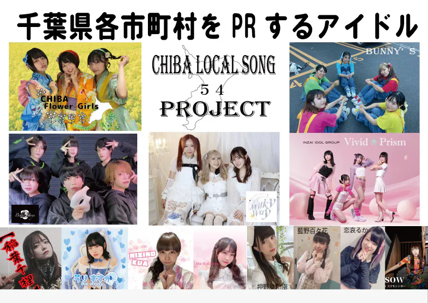 「CHIBA LOCAL SONG PROJECT54」といいます。私達は、2024年4月~立ち上ったプロジェクトチームで、歌とアーティストの力で千葉県54市町村をPRしています。このプロジェクトを推進するのはアイドル&シンガーたちです。彼女たちは歌とパフォーマンスで多くの方を元気にする活動をしており、その魅力とパワーをもっと社会のために役立てたいという気持ちから「社会貢献型」というテーマを元に活動を始めました。2024年4月~スタートし、すでに10市町まで広がりました。私共の活動は、このプロジェクトに共感してくださる方からのクラウドファンディングのご支援によって実現しています。