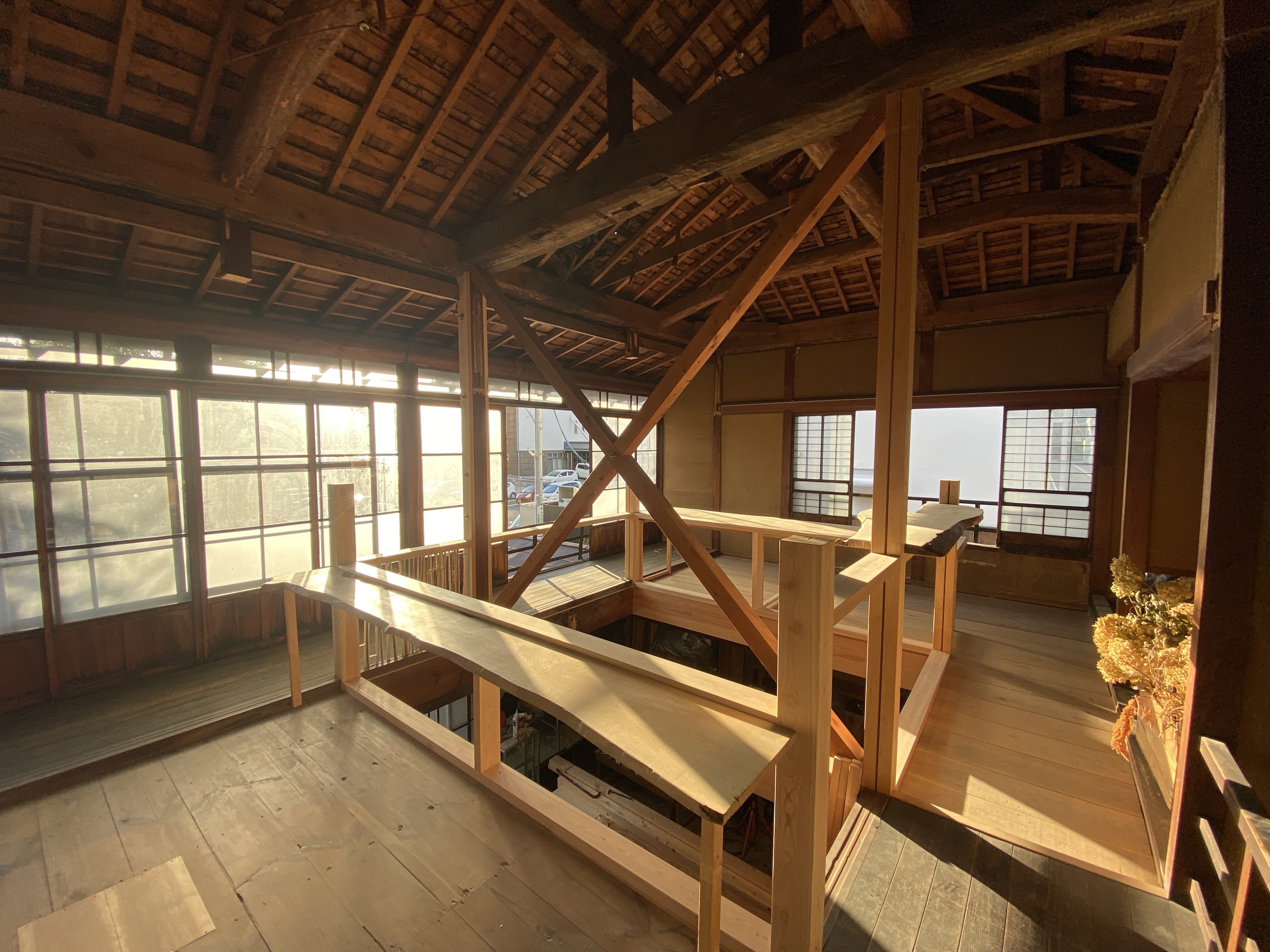 空間には、1947年(昭和22年)に起きた飯田大火の際に、街への延焼を防ぐために付けられた柱への切り傷や、昔の木造建築に見られる資材・立派な梁がそのまま残っています。