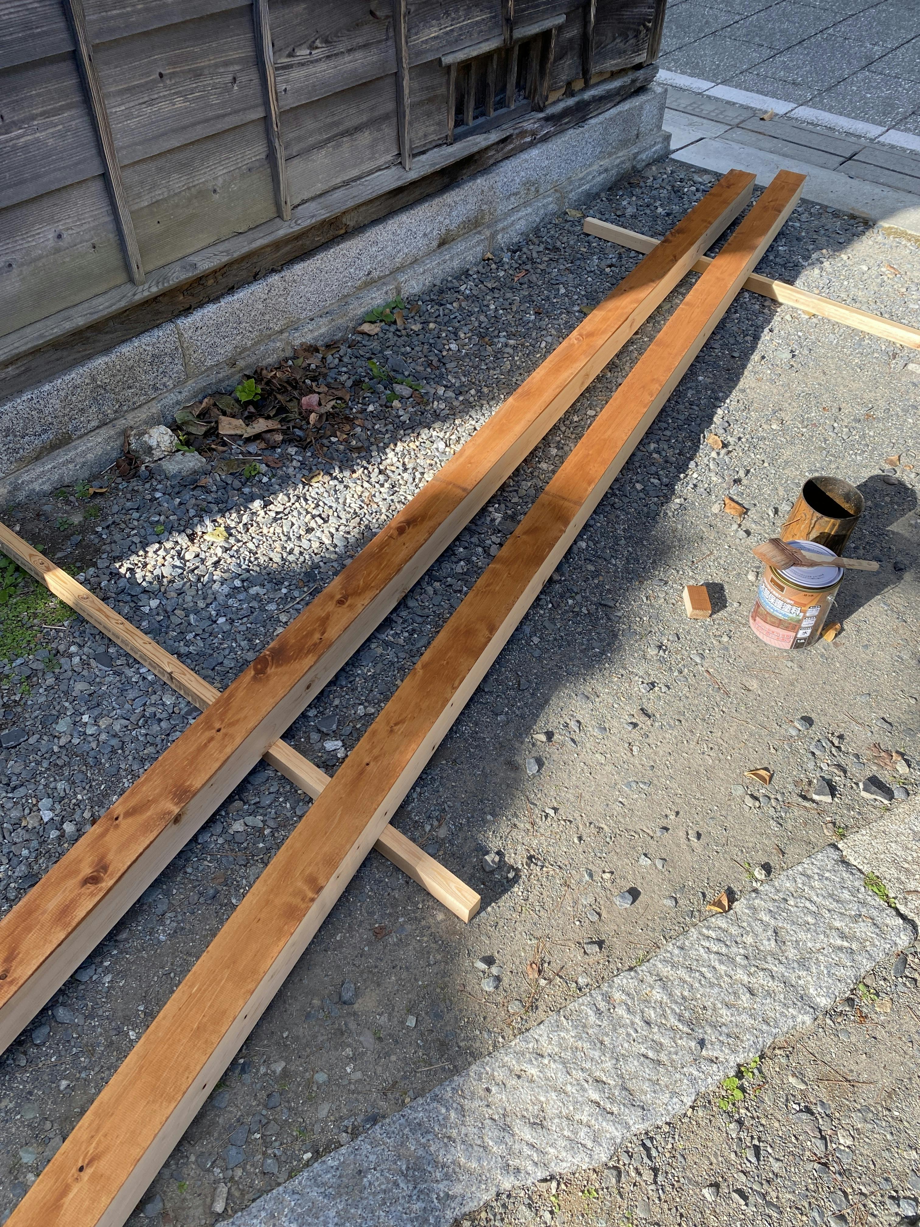 柱への色塗りは設置する前に行う必要があるので、見習い大工中の学生にお願いしました。