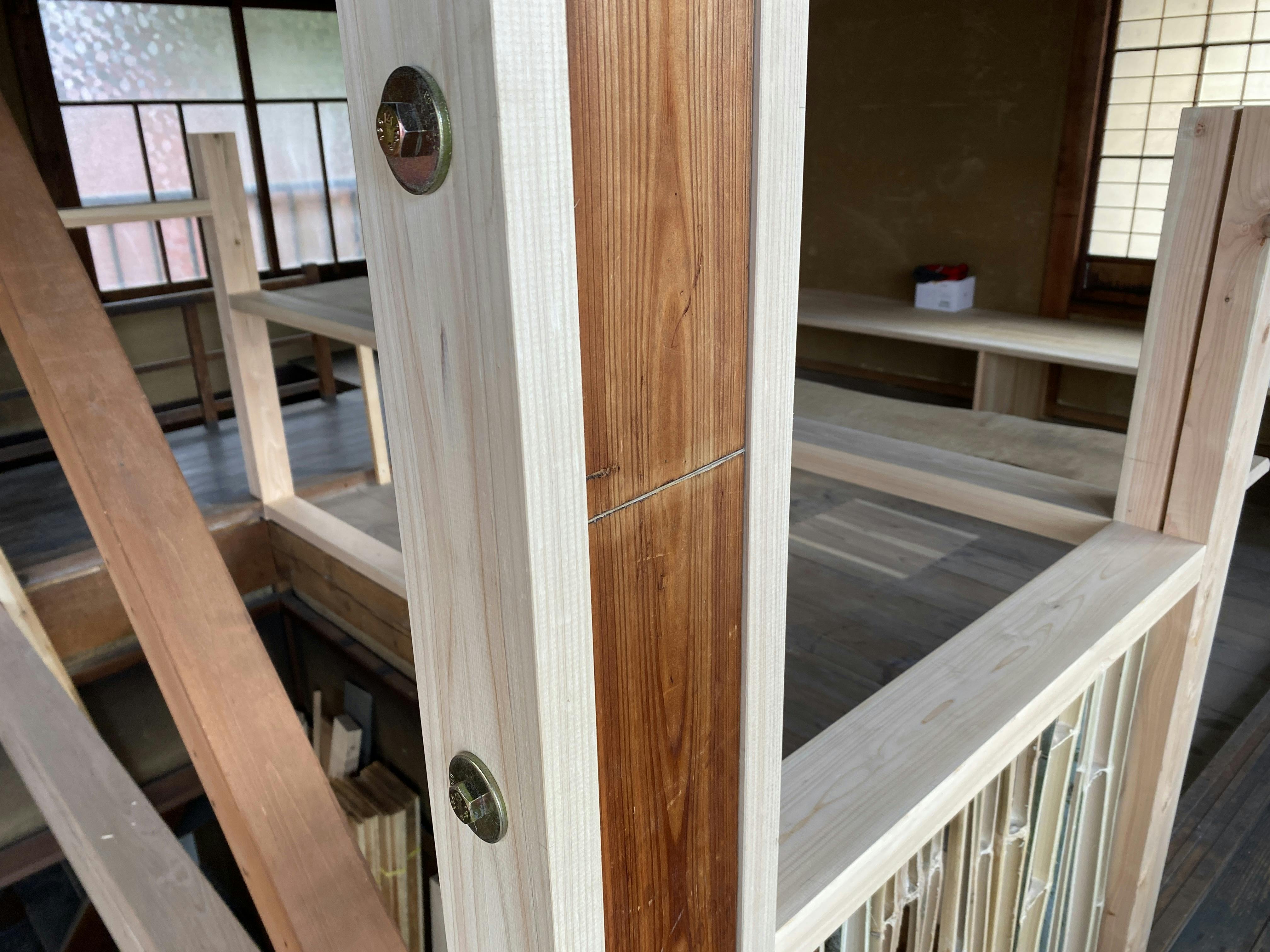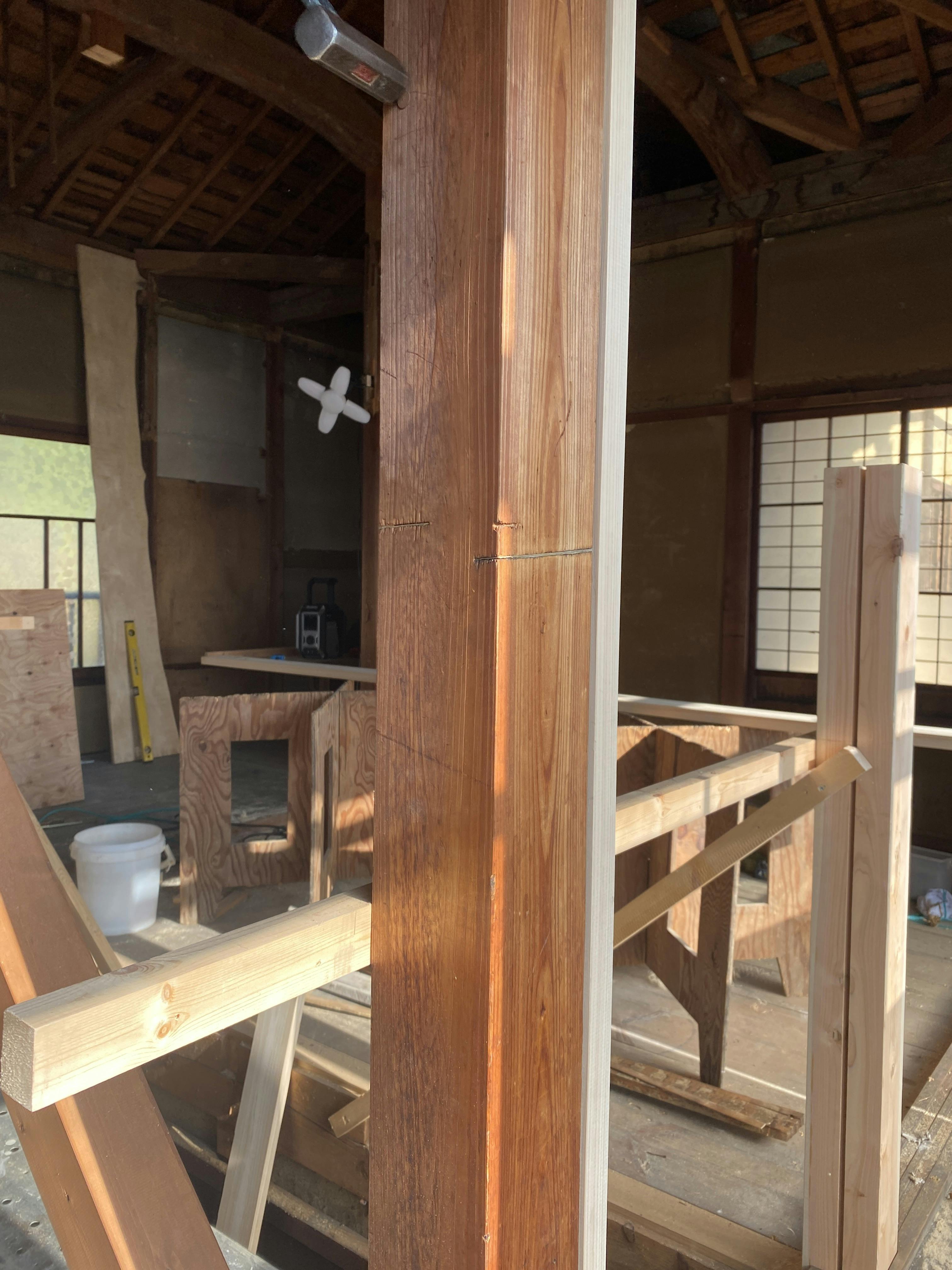 それを傷を残すようにサイドから新しい木材で挟み込むたちで補強していただきました。