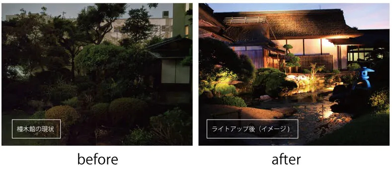 もし、このプロジェクトを達成できましたら、上記イメージ図のような夜間ライトアップを行い通常は17時までの拝観施設の時間を延長し、夜間のライトアップした庭園を見に来ていただくなどの企画も行います。文化財としての施設に付加価値をつけ、今まで以上に多くの皆さまに愛される施設を目指してこの館を後世に残してまいりたいと考えております。