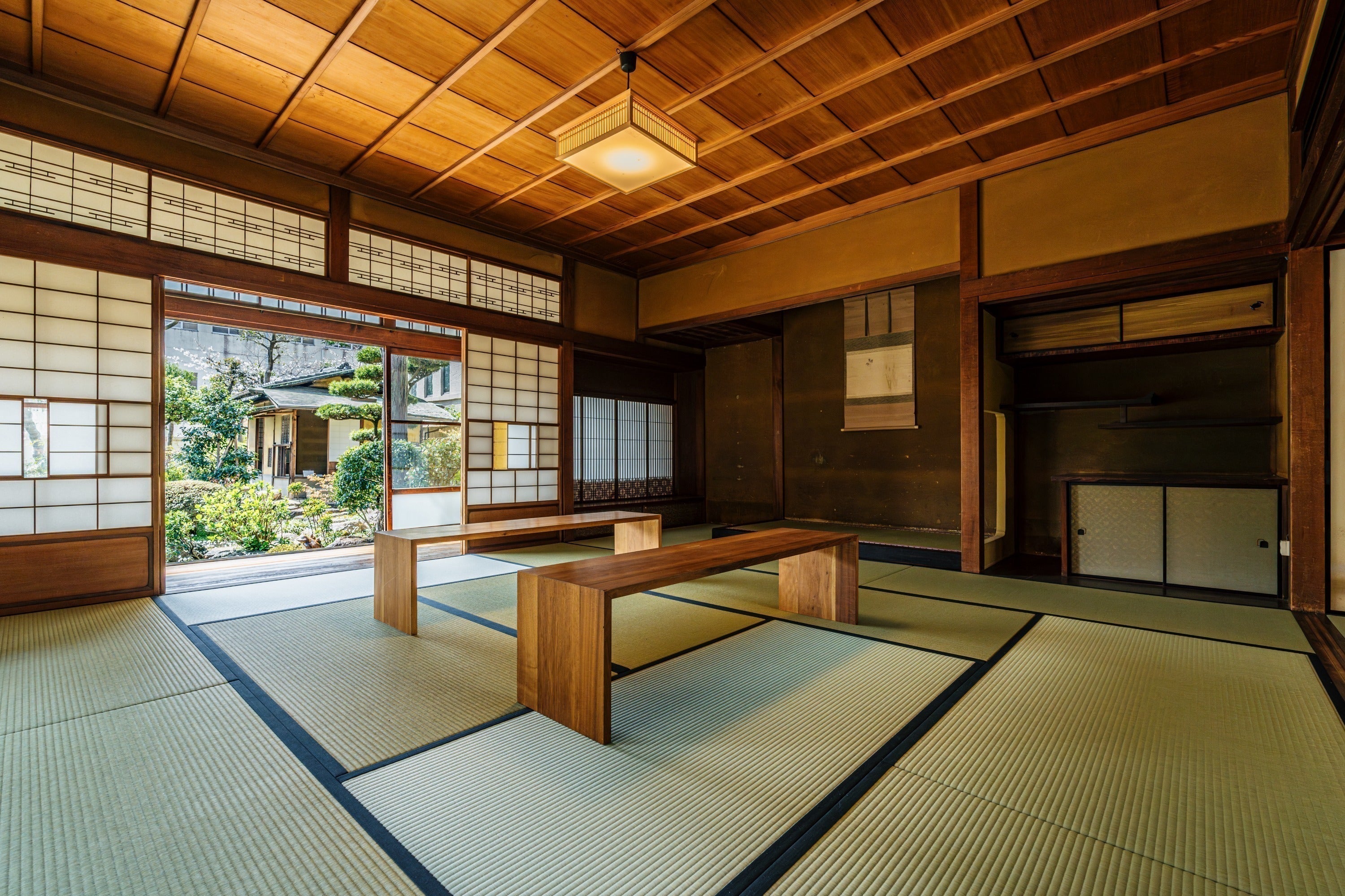 日本家屋は本館と仕切りの引き戸を閉めると独立した離れになる客座敷で構成されており、要所に贅沢な細工が施される一方で、通気を考えた無双窓や子供の部屋の畳には縁(ヘリ)を使わないなど、機能性と合理性に配慮した建物となっております。