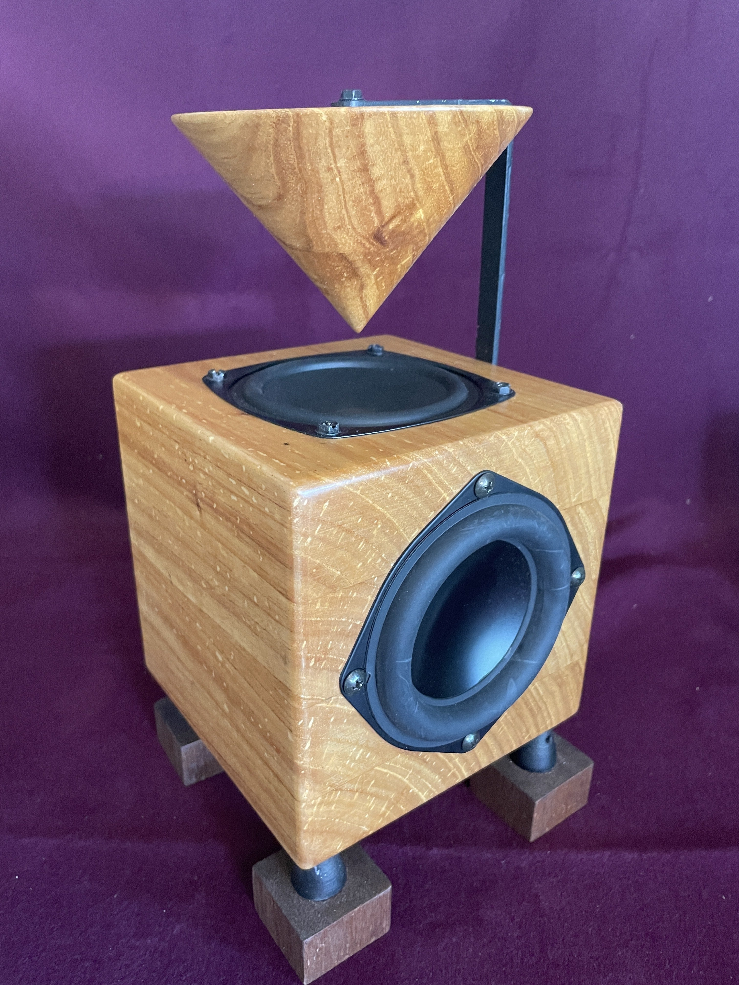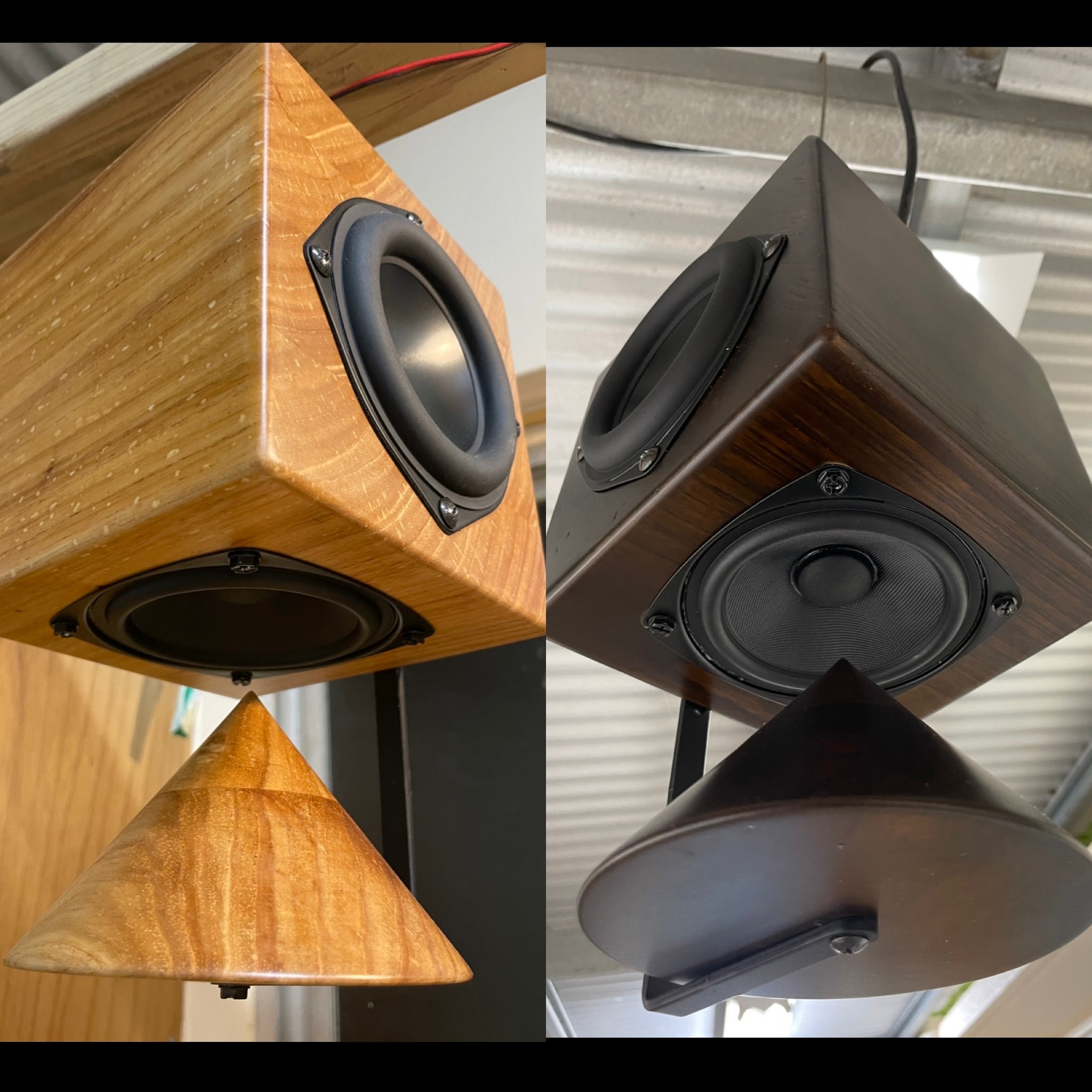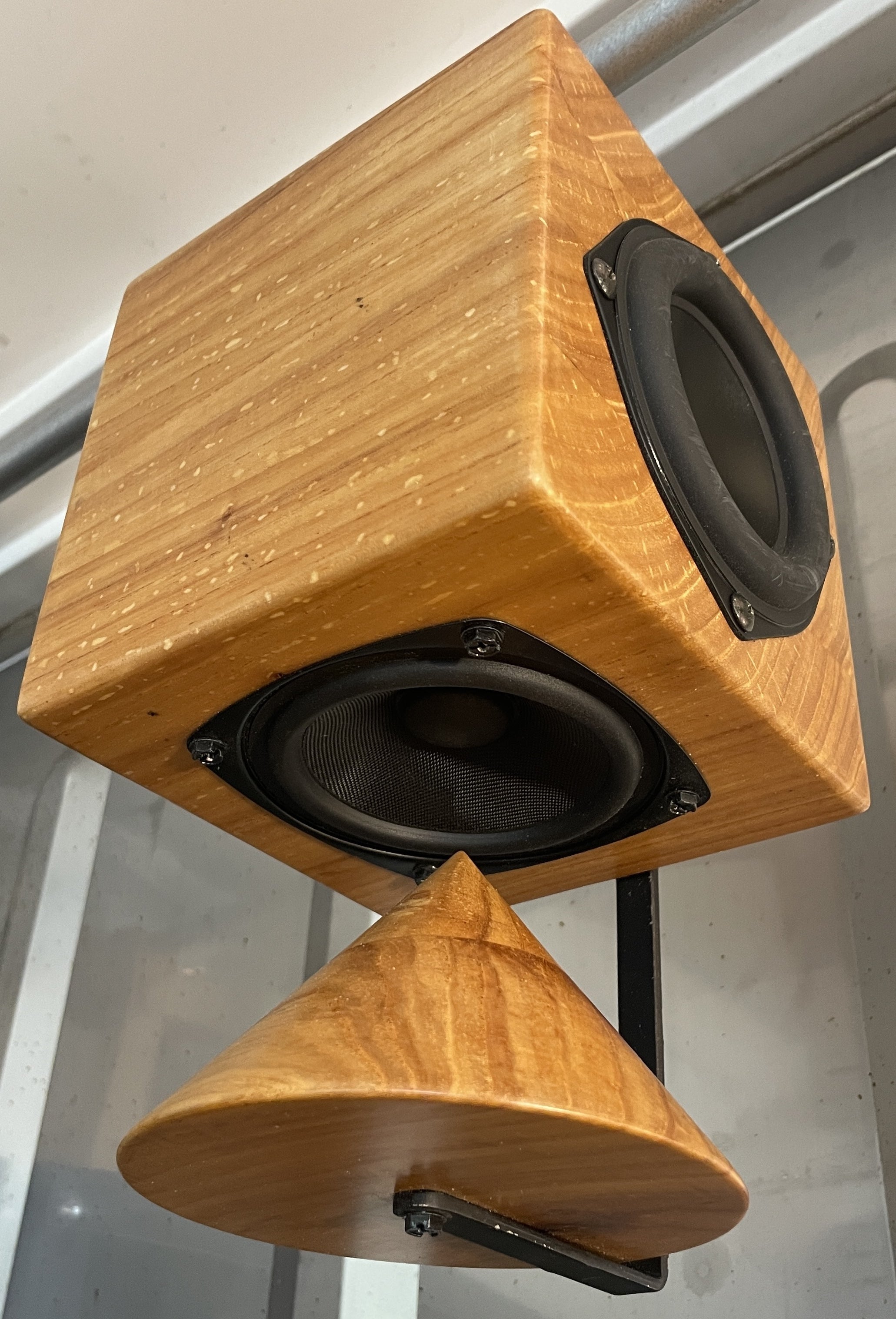 様々なサイズで試作を繰り返し、密度の高さと一定のパワーを保ちつつ気軽に天釣りできるギリギリのサイズとして、スピーカーエンクロージャー が約15cm、2.4kg前後となり、コンクリートや木材の梁にアンカー1つで吊るす事が出来るサイズになりました。