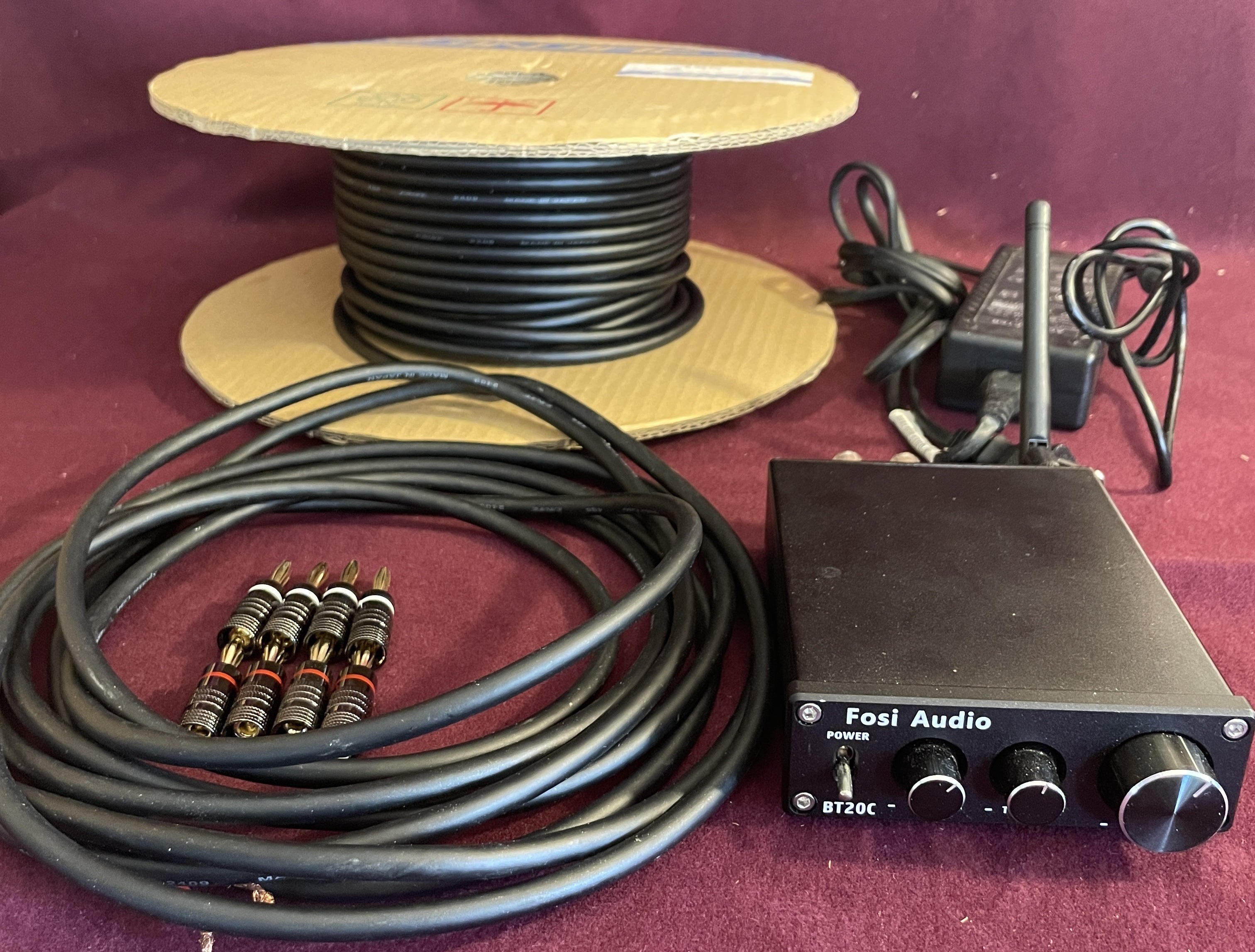 小型BTアンプ、電源、スピーカーケーブル、取扱説明書、専用箱
