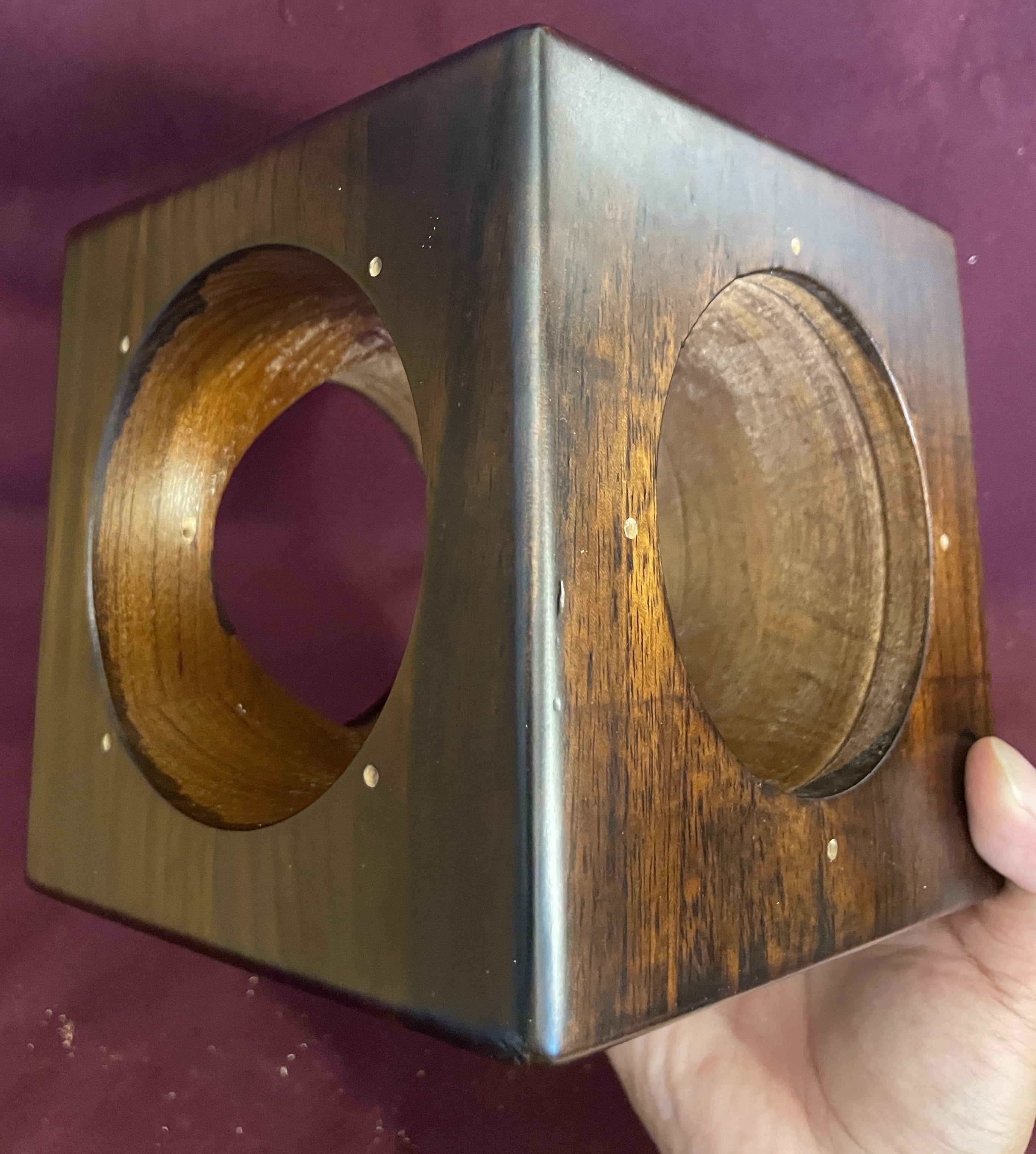これらの木材は全て沖縄県産の広葉樹で作られており、四角い板を6枚貼り合わせた箱ではなく、圧縮接着して作られたボックス型の状態から円錐状に音の通り道だけをくり抜き、削り出しで作られています。