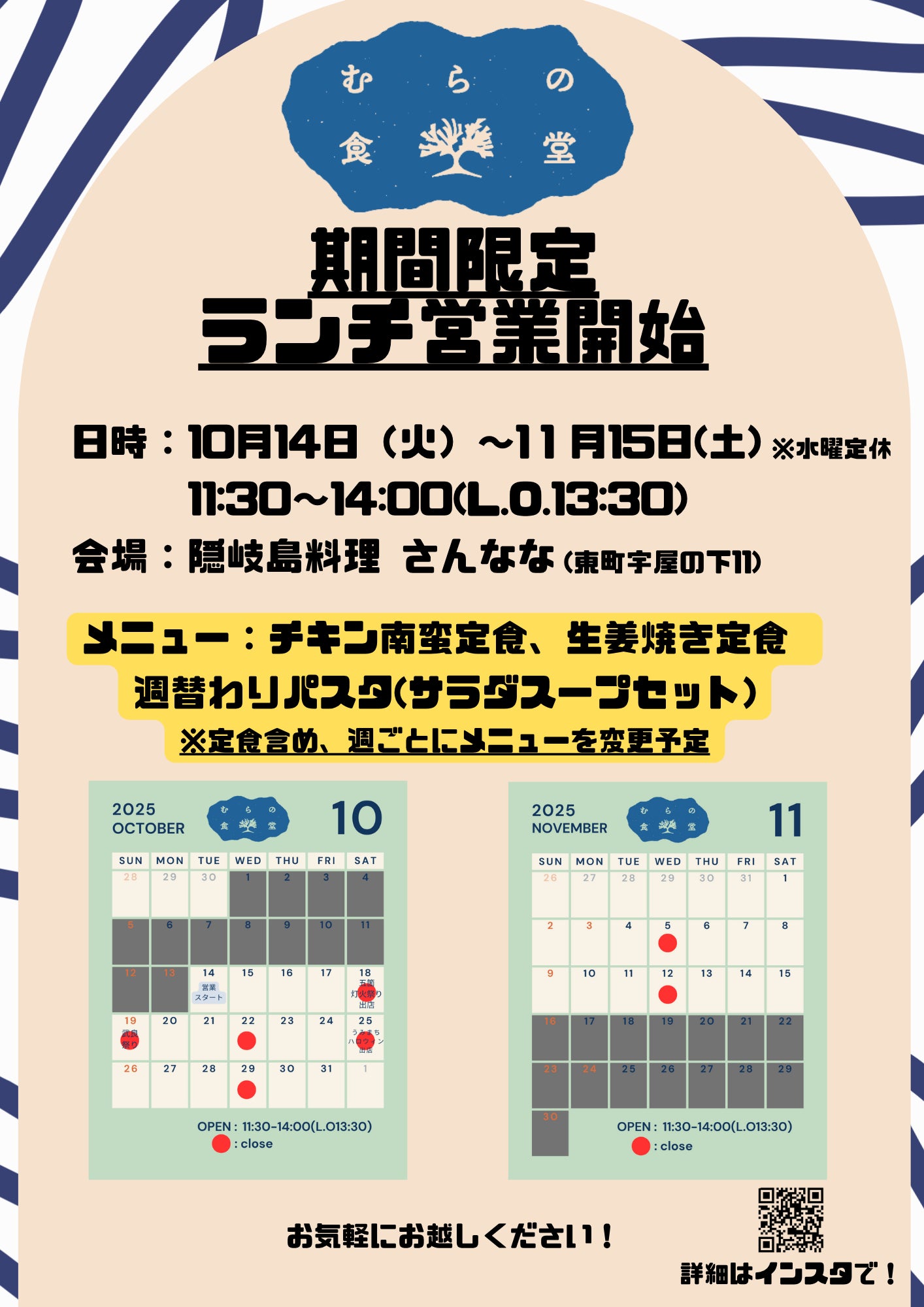 2025/10/16 00:3710月14日から11月15日まで(※水曜定休・変則あり)、さんななさんの店舗をお借りして「むらの食堂」としてランチ営業を行っています。定食やパスタなど、今後のメニュー候補となる料理を提供しながら、市場調査やオペレーションの確認、メニューの試作を目的とした営業です。今回の営業にあたり、調理器具や備品の購入などにクラウドファンディングでいただいたご支援を活用させていただきました。ご支援くださった皆さま、本当にありがとうございます。実際の営業を通じて多くの学びがあり、来春の本格オープンに向けて大きな一歩を踏み出すことができました。今後も準備の進捗を随時ご報告いたしますので、引き続き応援よろしくお願いいたします。 もっと見る