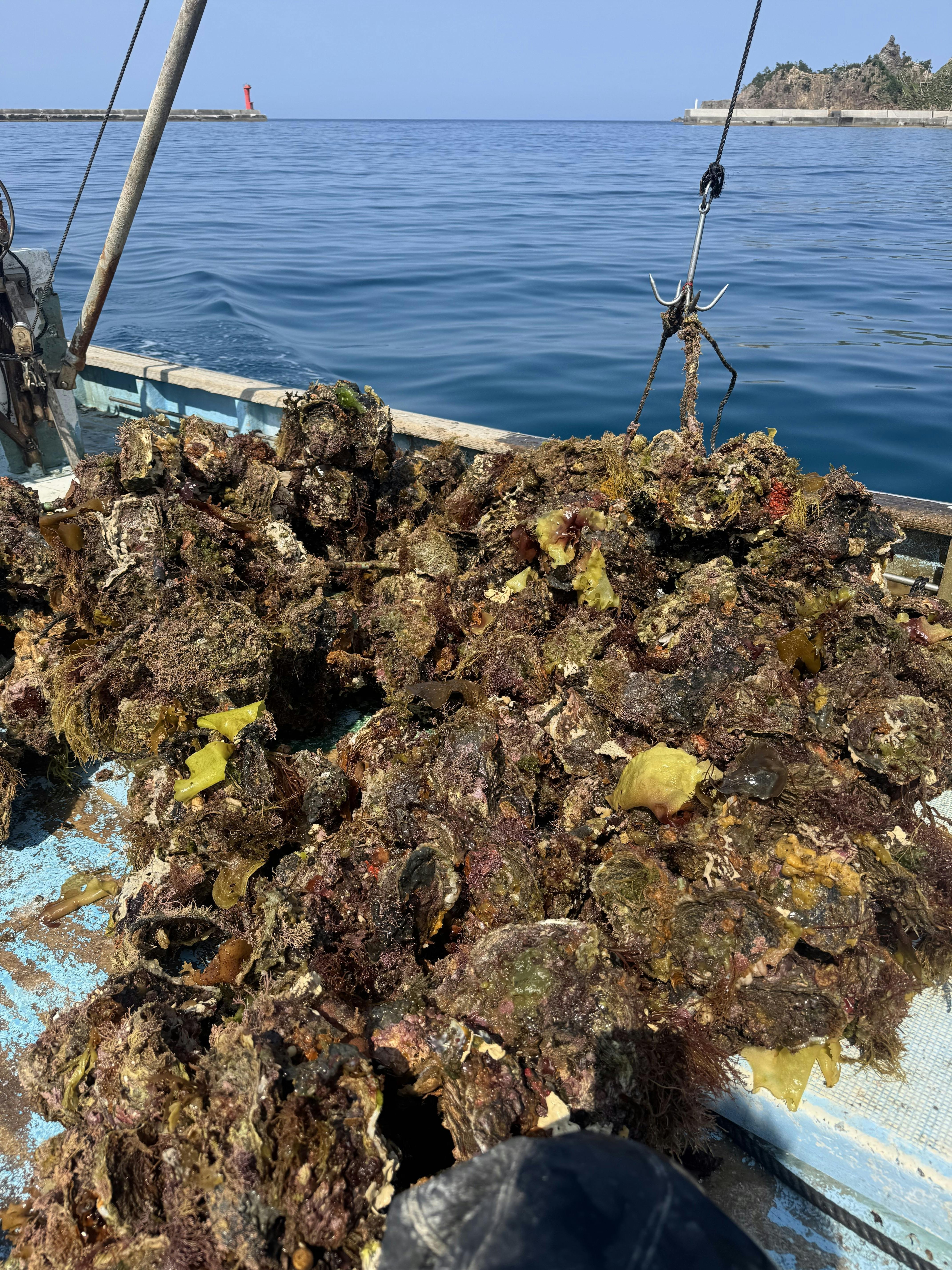 今日も朝から牡蠣の処理を行ってます!海から引き上げに10本ロープを引き上げました。大きく形のいいものは、生食よ用に大きすぎ、小さいもの、形の悪いものは、カキフライ用に使用します。今月いっぱいまで出荷できそうなので、リターンにまだ牡蠣はありますので、ご検討ください。