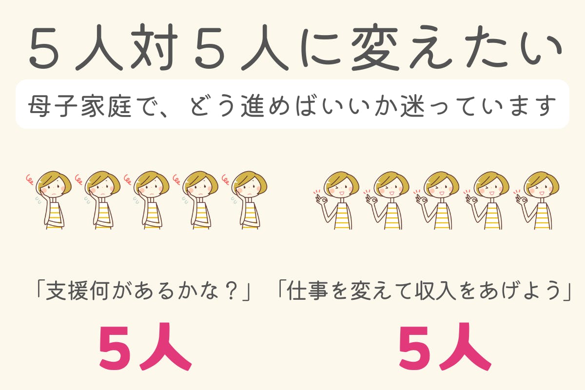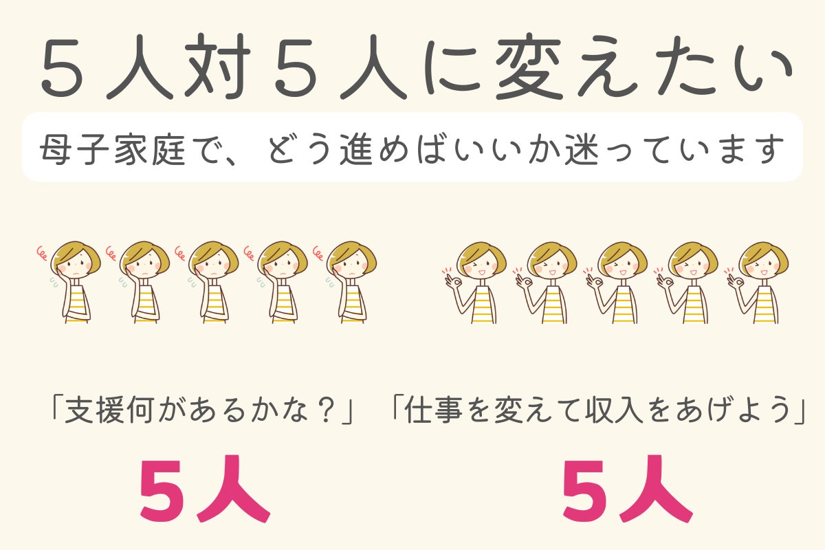 「支援制度」を知ることも大事ですが、未来を創るためには「収入を上げて生活を安定させる」ことが必須となります。10人に相談した時、5人が支援制度を教えてくれて、5人が収入を上げられるよと教えてくれる。情報の均衡が取れれば、シングルマザー自身が選択することができるようになります。