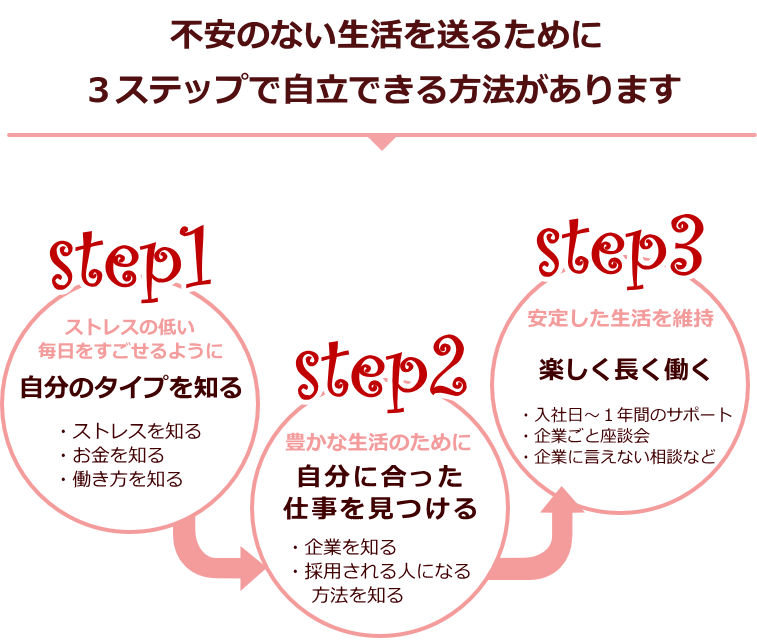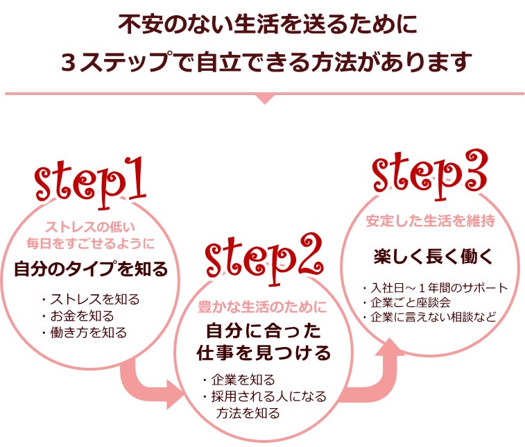 女性の不安と恐怖心を払拭しながら、生活の安定を一番に考えた就職をサポートします。1,働く環境を整える 2,企業をご紹介 3,長く楽しく働くための1年間の定着支援