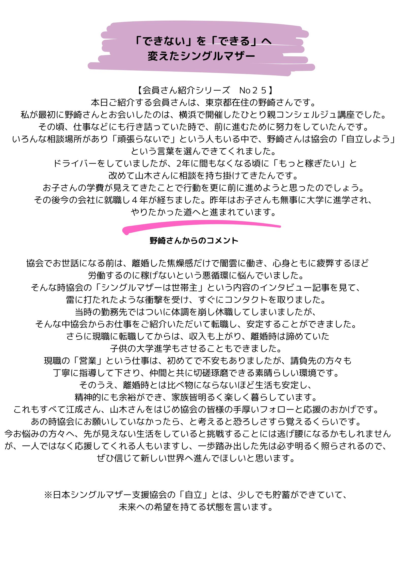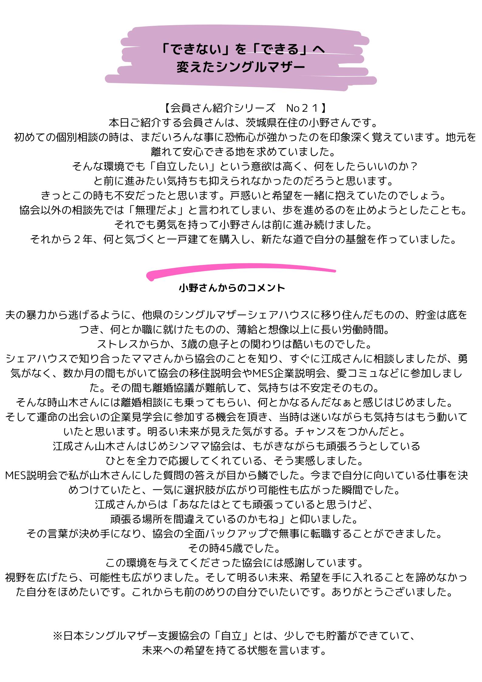 また本当に困っている人たちを支えるためには、支える側の力を付けることも考えなくてはいけません。現在、正しく「(自立が)できる」という情報に辿り着いたシングルマザーの多くは自立を果たしています。一緒に情報を届けて欲しいです。