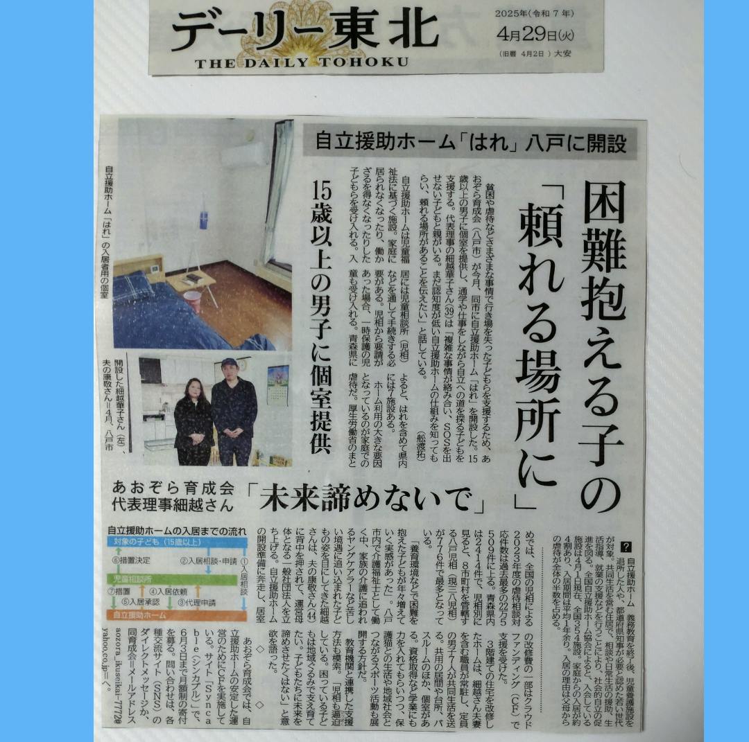 2025/05/05 10:37【2025年4月29日、自立援助ホーム はれ デーリー東北新聞社 掲載記事】2025年4月29日付け、デーリー東北新聞社様にて、はれ 開設後、初の取材記事が掲載となりました。2024年12月に開設準備時に、第一回目今回は、2回目の取材記事掲載となります。本記事及び、あおぞら育成会、自立援助ホーム はれ が青森県の児童福祉事業発展に貢献していくことを祈り、法人及び、ホーム運営に邁進していきます。八戸地域の児童福祉分野の社会インフラとして、貢献してまいります。何卒、ご協力、ご支援引続きよろしくお願い申し上げます。チルドレンサポーター100人の輪プロジェクト もっと見る
