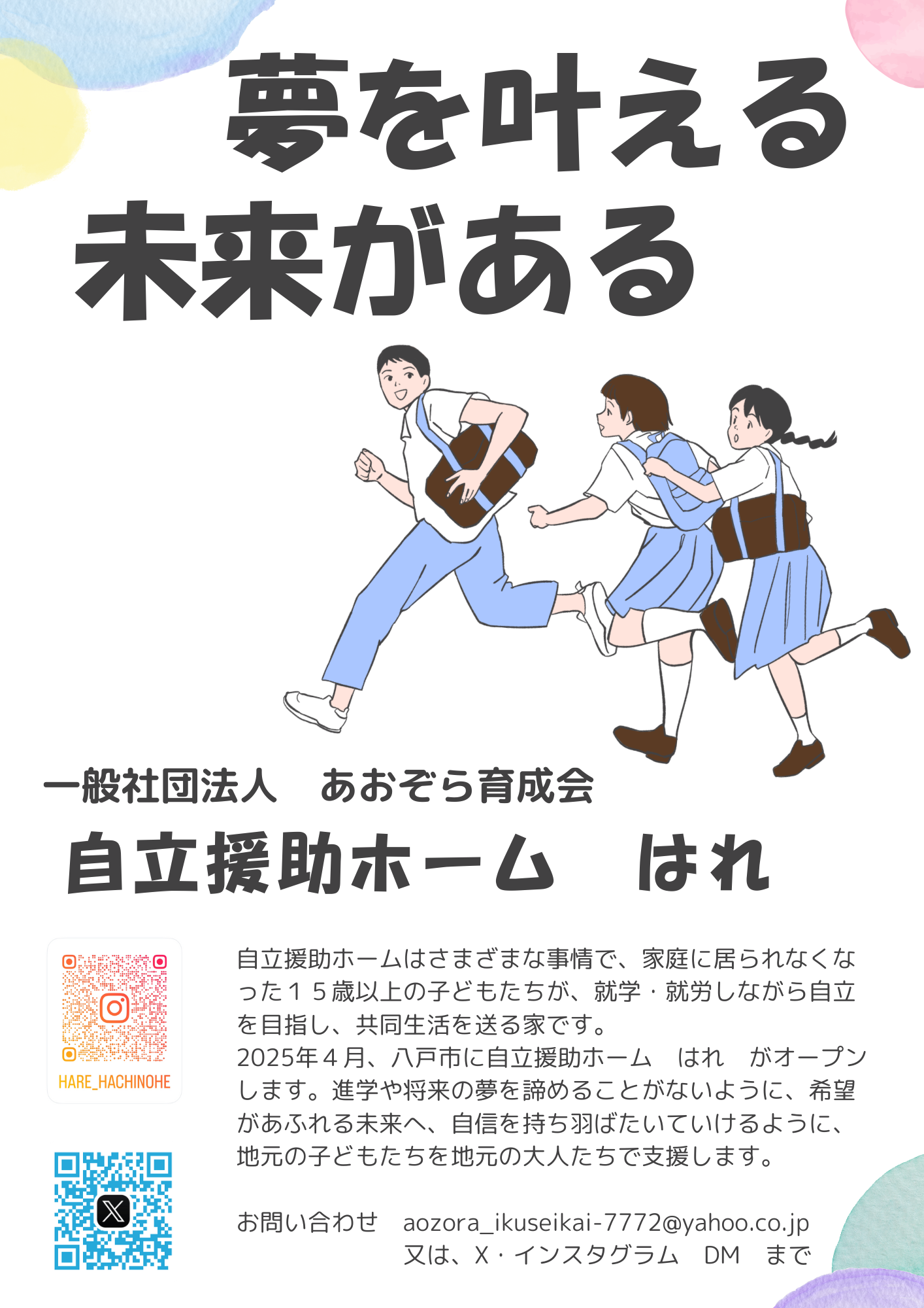目的は、自立援助ホームを学生さんたちに、知ってもらうために、学生向けの案内(ポスター)を校内に掲示していただくためです。