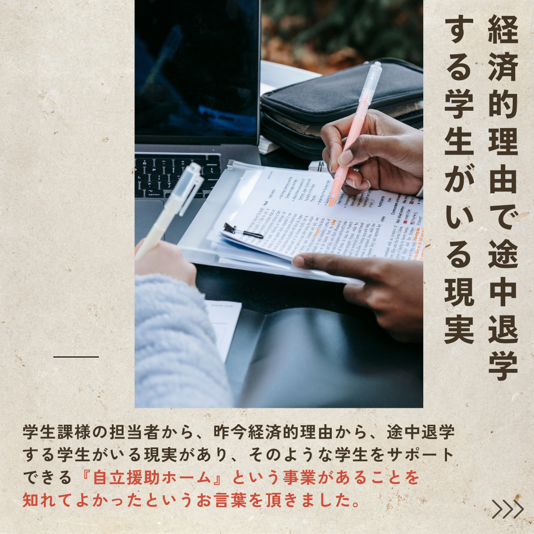 そのような状況にある若者が、自立援助ホームを利用しながら、将来の夢を諦めずに就学を継続できる道があることを知ってもらいたいと思っています。
