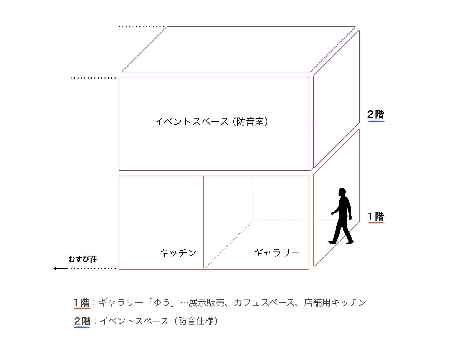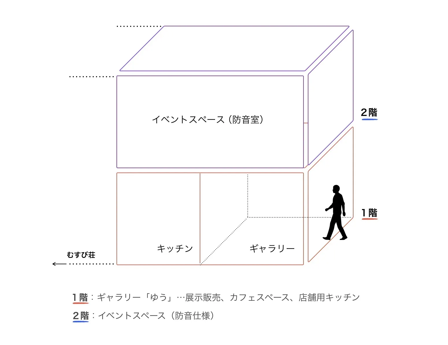 上の絵のように1階には店舗・ギャラリースペース、2階には45㎡の防音のイベントスペース(25畳)があります。建物の奥にいくとシェアハウスがあり、うなぎの寝床のような長屋になっています。