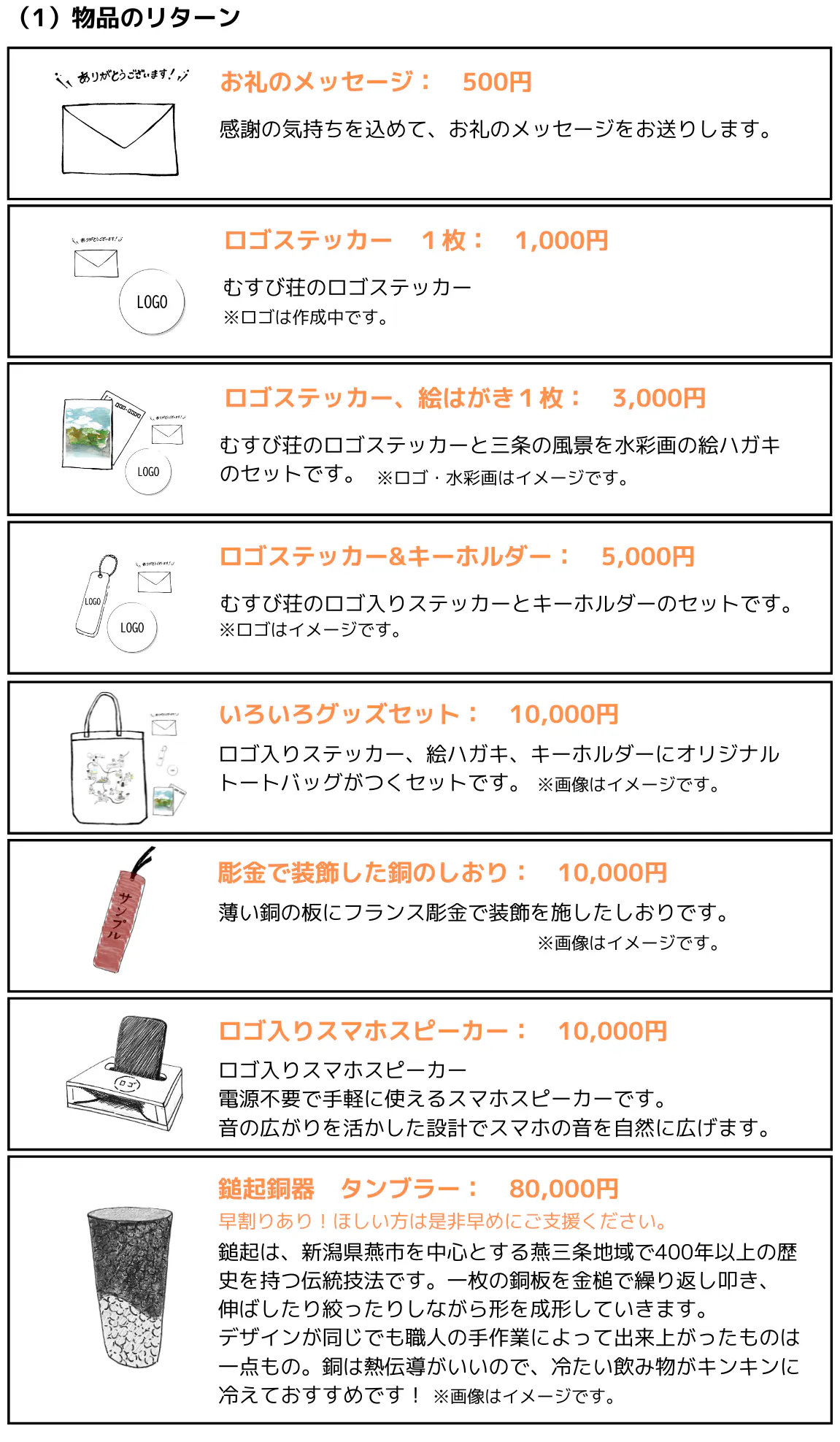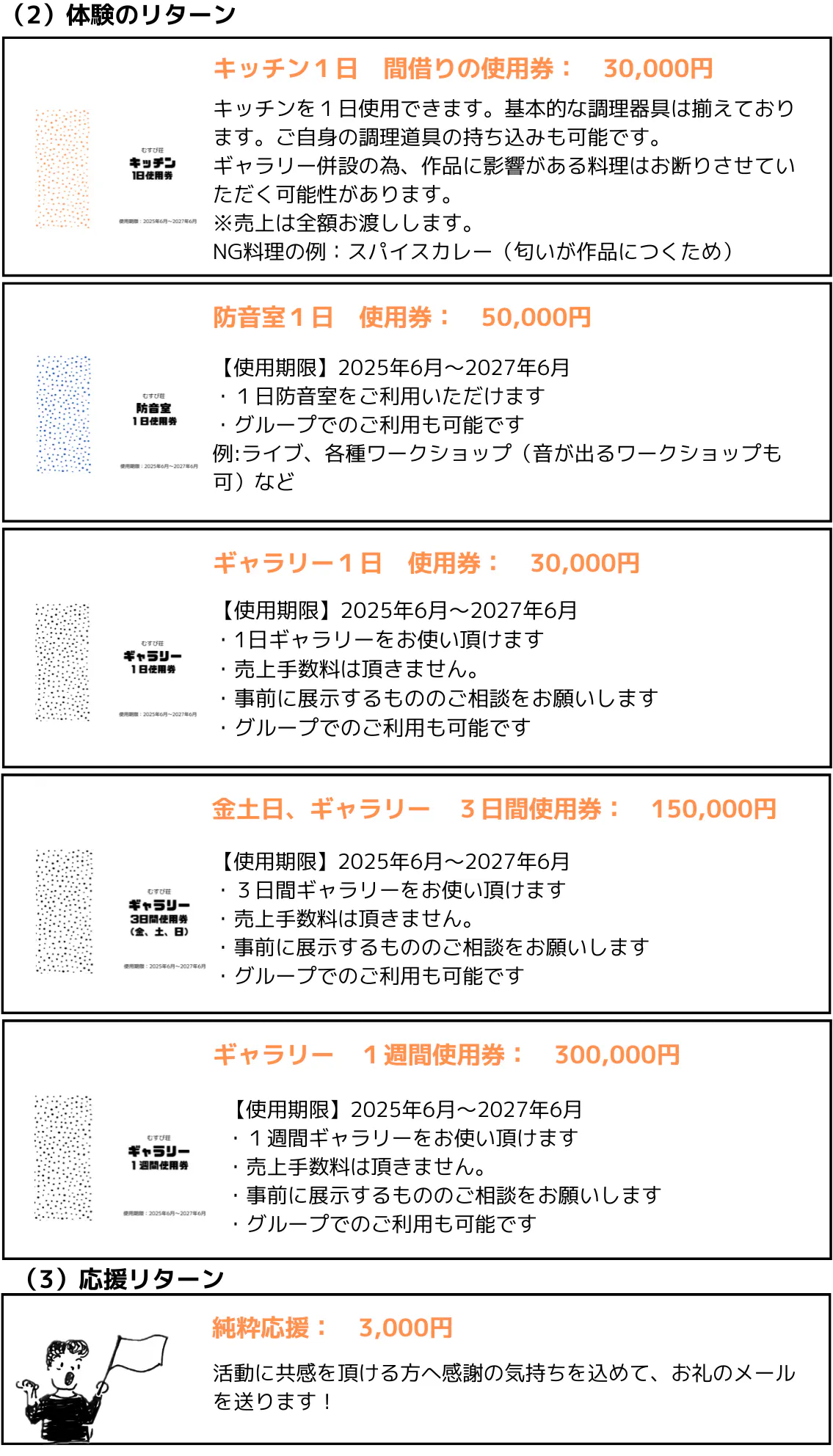 ※本プロジェクトのリターンの有効期限を設けている使用権のリターンについて、有効期限内にやむを得ない事情によりご案内が困難になった場合には、有効期限について個別に調整させていただくこととし、ご返金は致しかねますのでご了承ください。