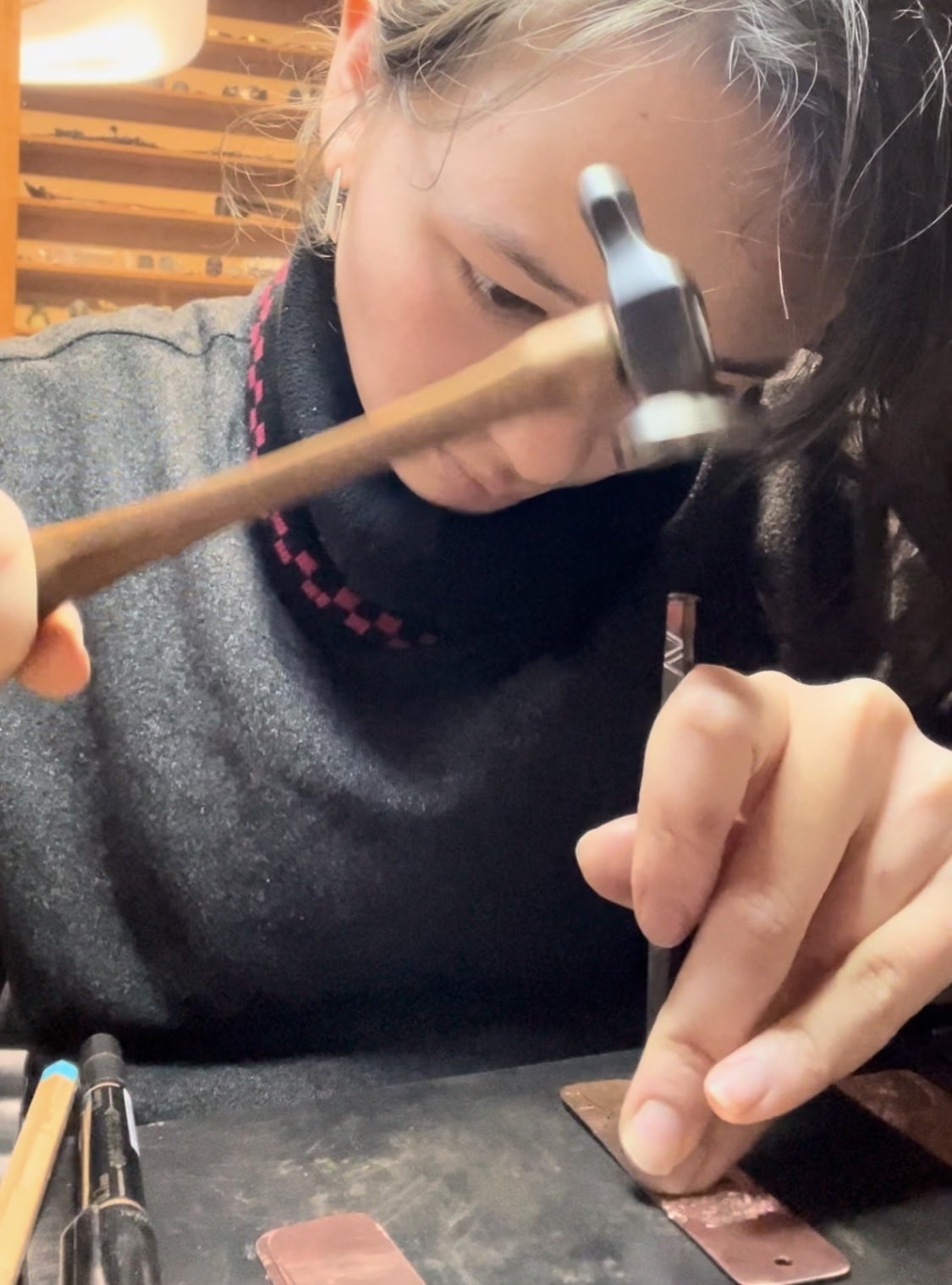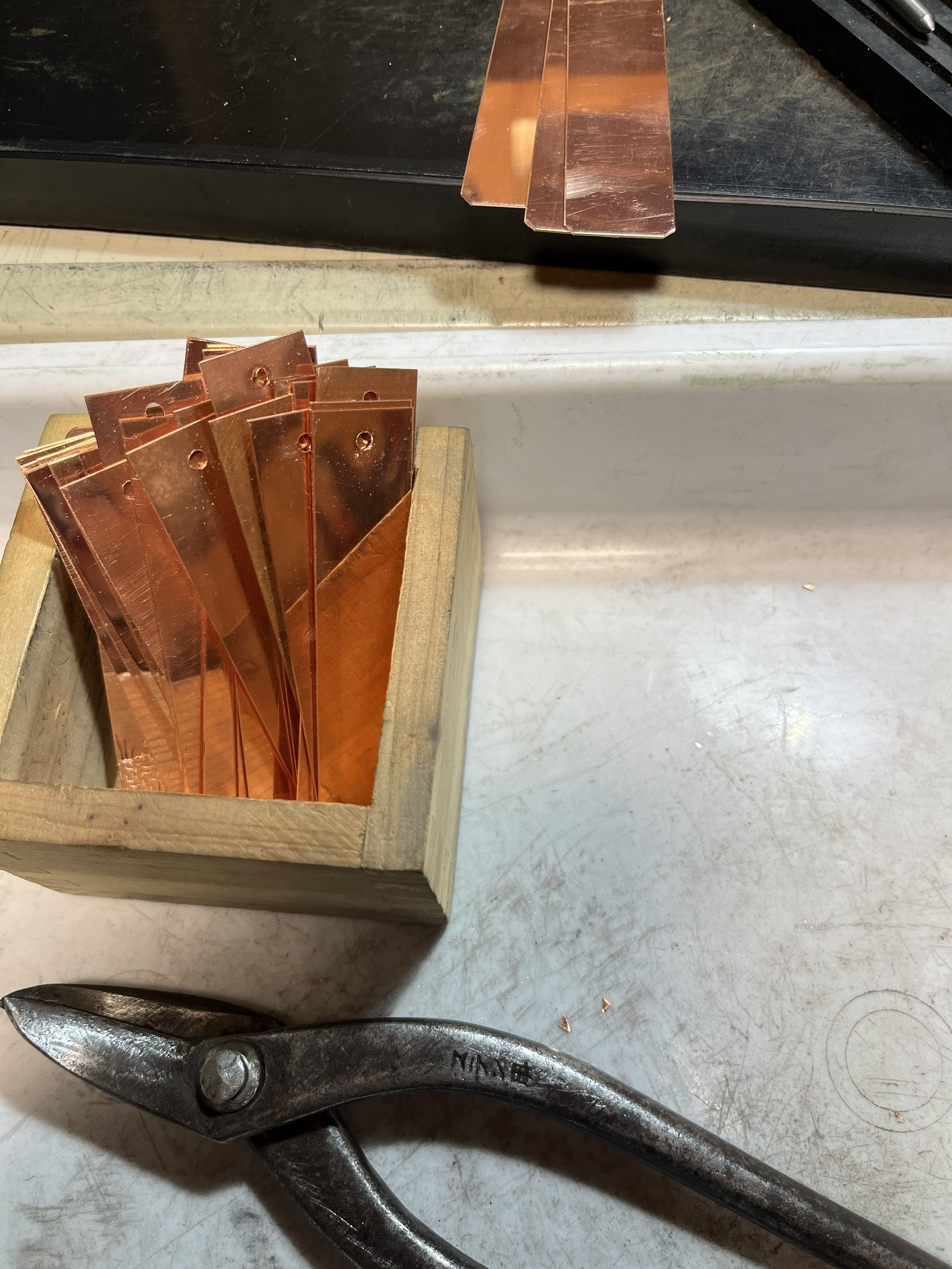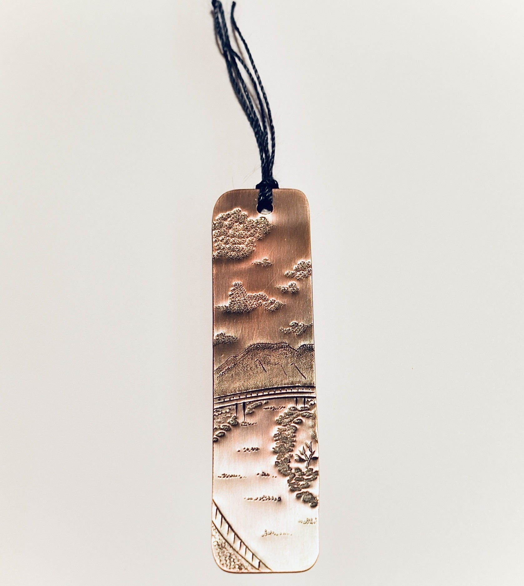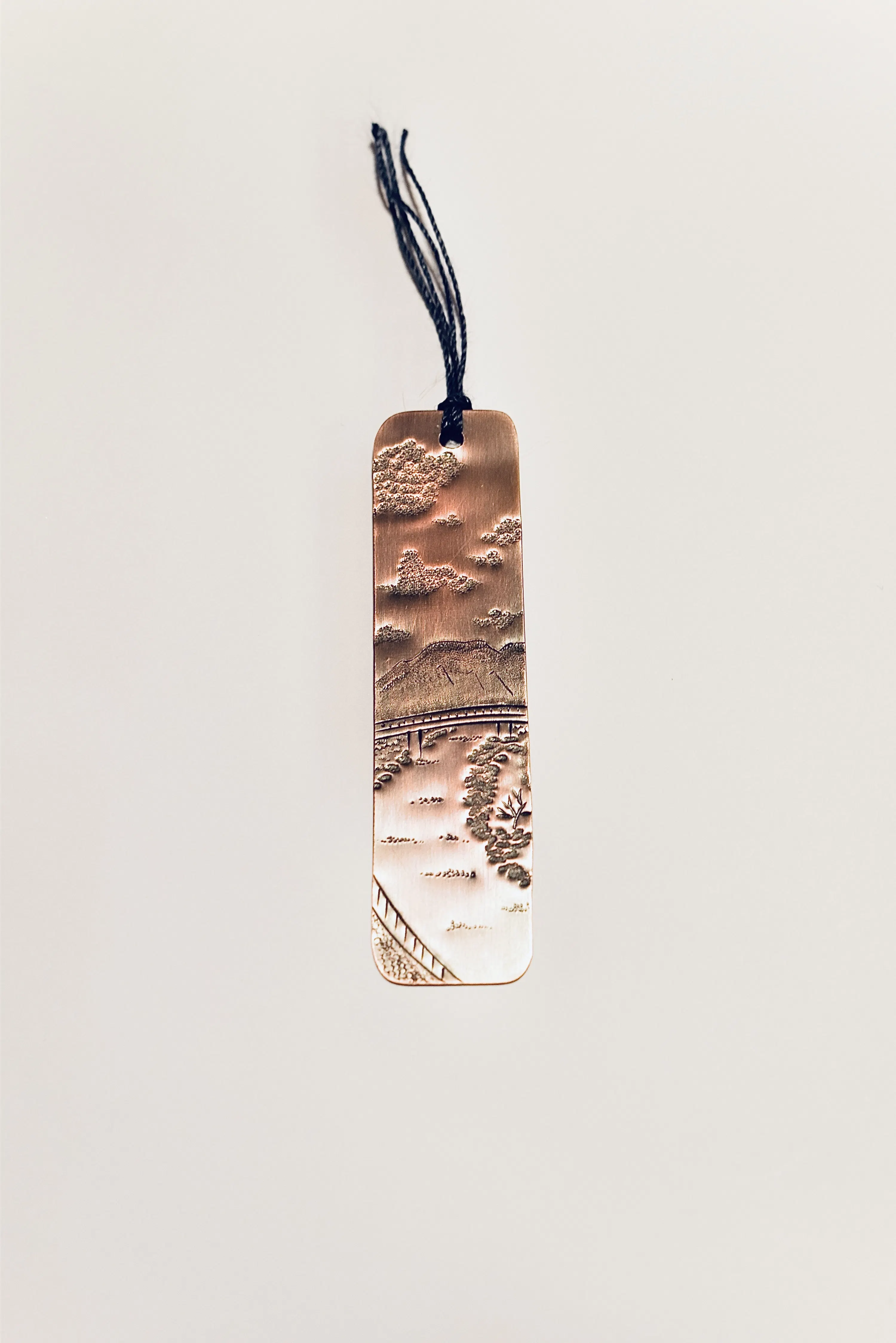 一枚一枚、銅板を切って、彫金を施して作る銅のしおり。仕上げには硫化着色で銅を少し黒くして、天然のロウをコーティングしていきます。使って行くにつれ、経年変化で銅の色も少しづつ変わって行く、長年楽しんでいただけるしおりになっています。