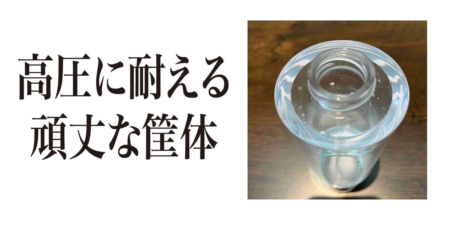 本製品の特長の一つとして、高濃度水素生成に欠かせない圧力制御に関する特許技術があります。高濃度の水素水を生成するためには高い圧力が必要になるため、ボトル内の圧力を高いまま維持する必要があります。