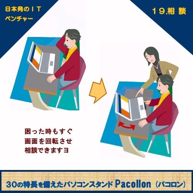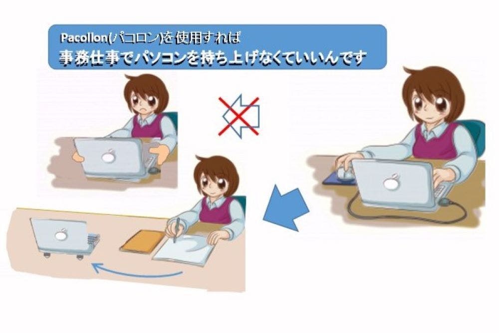 ノートパソコンに向かい仕事をする際に、両手でパソコンの位置を調整するのがとても面倒!この悩みを解決したのが、ノートパソコン移動スタンド “Pacollon (パコロン)” です。