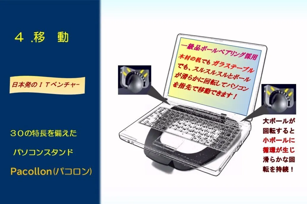 世界で唯一無二のパソコン移動スタンドPacollon(パコロン)。 昔のマウスに使われていたトラックボールのように、木・スチール・ガラスなど机の材質に関わらず、ノートパソコンを移動してくれます。30の特長を備えた日本製です。ご支援よろしくお願いいたします。