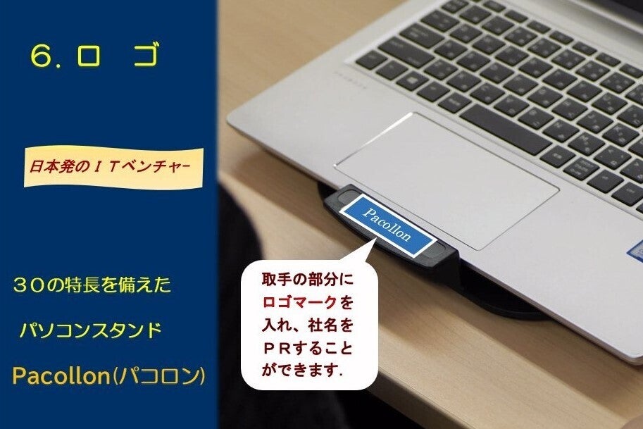Pacollon (パコロン)は、ノートパソコンの位置調整を指先で行えるノートパソコン移動スタンドです。180グラムとスマホ並みに軽く、2つ折りすれば A4サイズに収まり、ノートパソコンと一緒に商談や会議の席に持ち運べます。パソコン画面を回転させ相手に見せることができるので、プレゼ時間が短縮します。