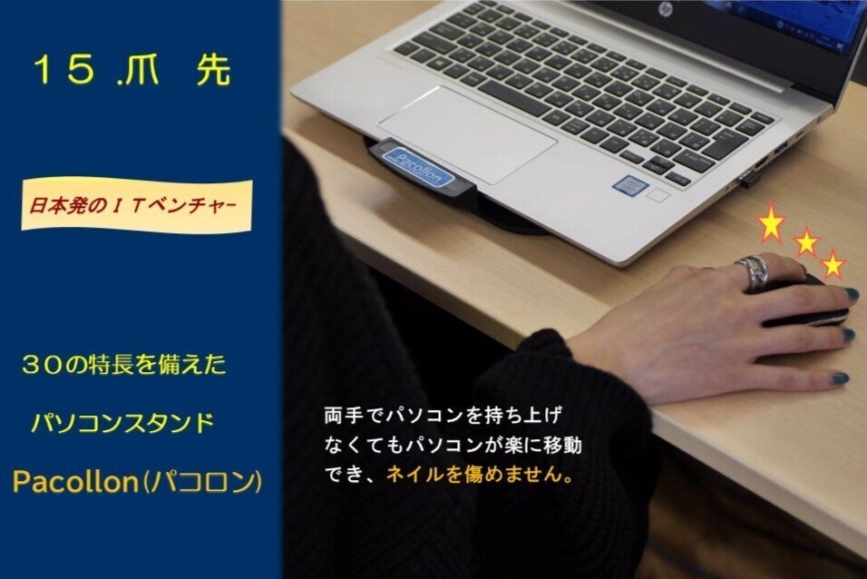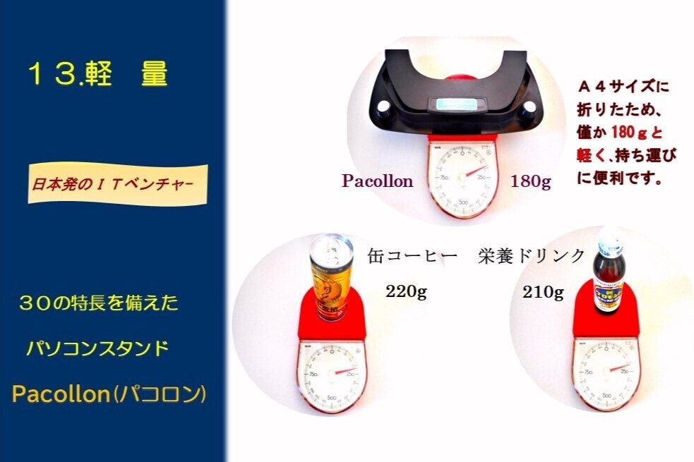 Pacollon (パコロン)は、ノートパソコンの位置調整を指先で行えるノートパソコン移動スタンドです。180グラムとスマホ並みに軽く、2つ折りすれば A4サイズに収まり、ノートパソコンと一緒に商談や会議の席に持ち運べます。パソコン画面を回転させ相手に見せることができるので、プレゼ時間が短縮します。