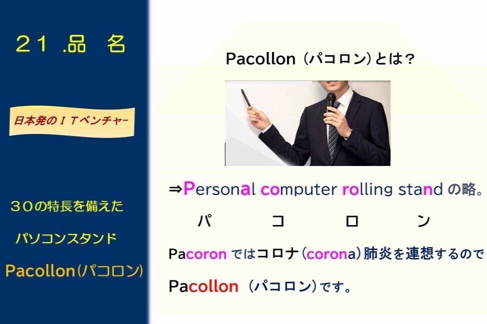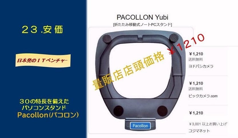 Pacollon (パコロン)は、ノートパソコンの位置調整を指先で行えるノートパソコン移動スタンドです。180グラムとスマホ並みに軽く、2つ折りすれば A4サイズに収まり、ノートパソコンと一緒に商談や会議の席に持ち運べます。パソコン画面を回転させ相手に見せることができるので、プレゼ時間が短縮します。