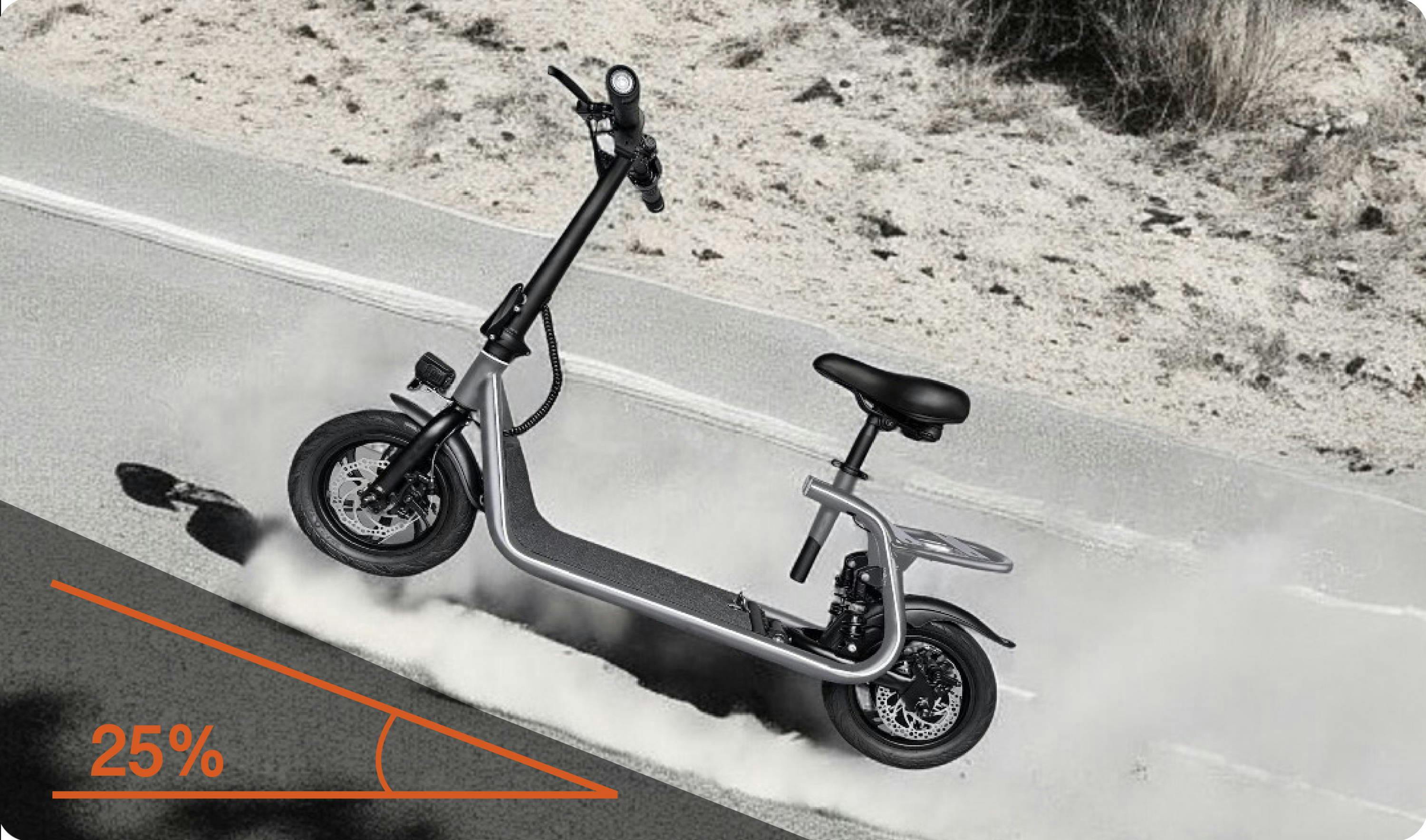 Kick O Cityは、48vバッテリーと最大750wまで引き上げ可能な強力モーターを搭載。