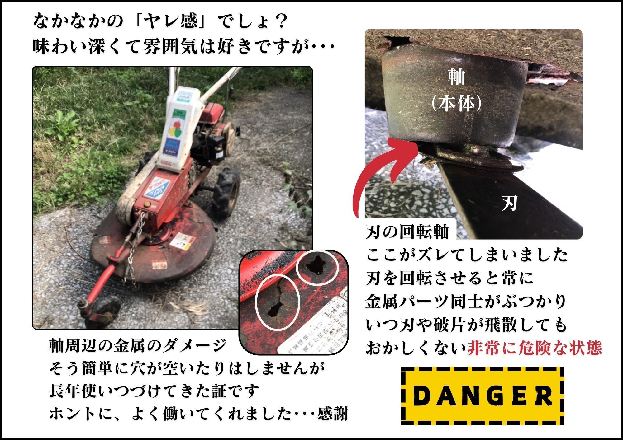 僕が農園を引き継いだときにはすでに百戦錬磨な状態で、工夫をこらして修理をしながら使ってきましたが、2024年シーズン終了後の草刈り作業でとうとう寿命となり、リアルタイムで草刈り作業が進んでいない現状です。刃の回転軸がズレてしまい、刃を回転させると常に金属パーツ同士がぶつかり、いつ刃や金属の破片が飛散してもおかしくない非常に危険な状態・・・