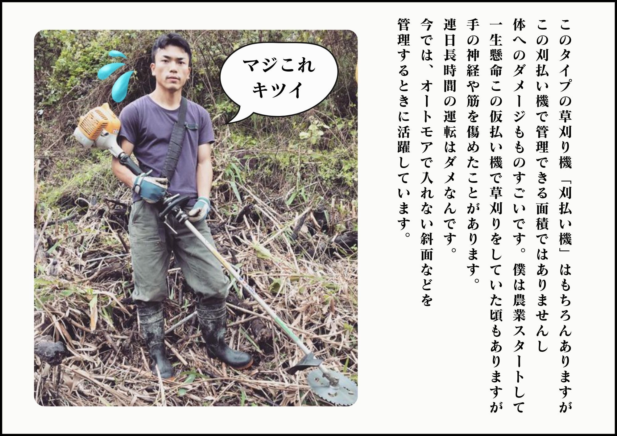 僕はオートモアのことを「モアちゃん」と呼び、草刈りが終わると「お疲れさ~ん。よくやったネ」だとか声をかけます。オートモアに限ったことではありませんが、機械も生きているからです。 シーズンスタート前に農園全体の草を刈るときにオートモアが必要ですし、栽培している甘夏と河内晩柑の旬が初夏~晩夏になるため、その時期の草の成長速度がものすごく早く「草刈りしないと収穫できない」という状況が必ず発生します。「収穫に使う体力を残しながら、草を短時間でサッと刈る」ことがとても重要になり、このときにもオートモアは必要不可欠です。