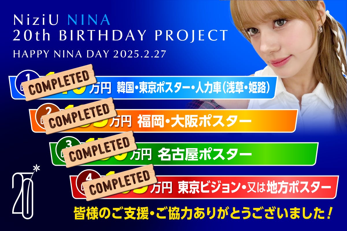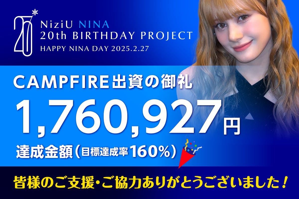 支援者の皆様いつもお世話になっております。ニナ誕生日企画です。皆様のご協力のお陰で目標額を大きく上回ることができました!!運営一同、心より感謝申し上げます。ハタチになるニナちゃんのお誕生日を盛大に祝えるよう尽力いたします!!広告掲載場所や企画は2/5以降に随時公開!お楽しみに☺︎引き続き何卒よろしくお願いいたします。ニナ誕生日企画