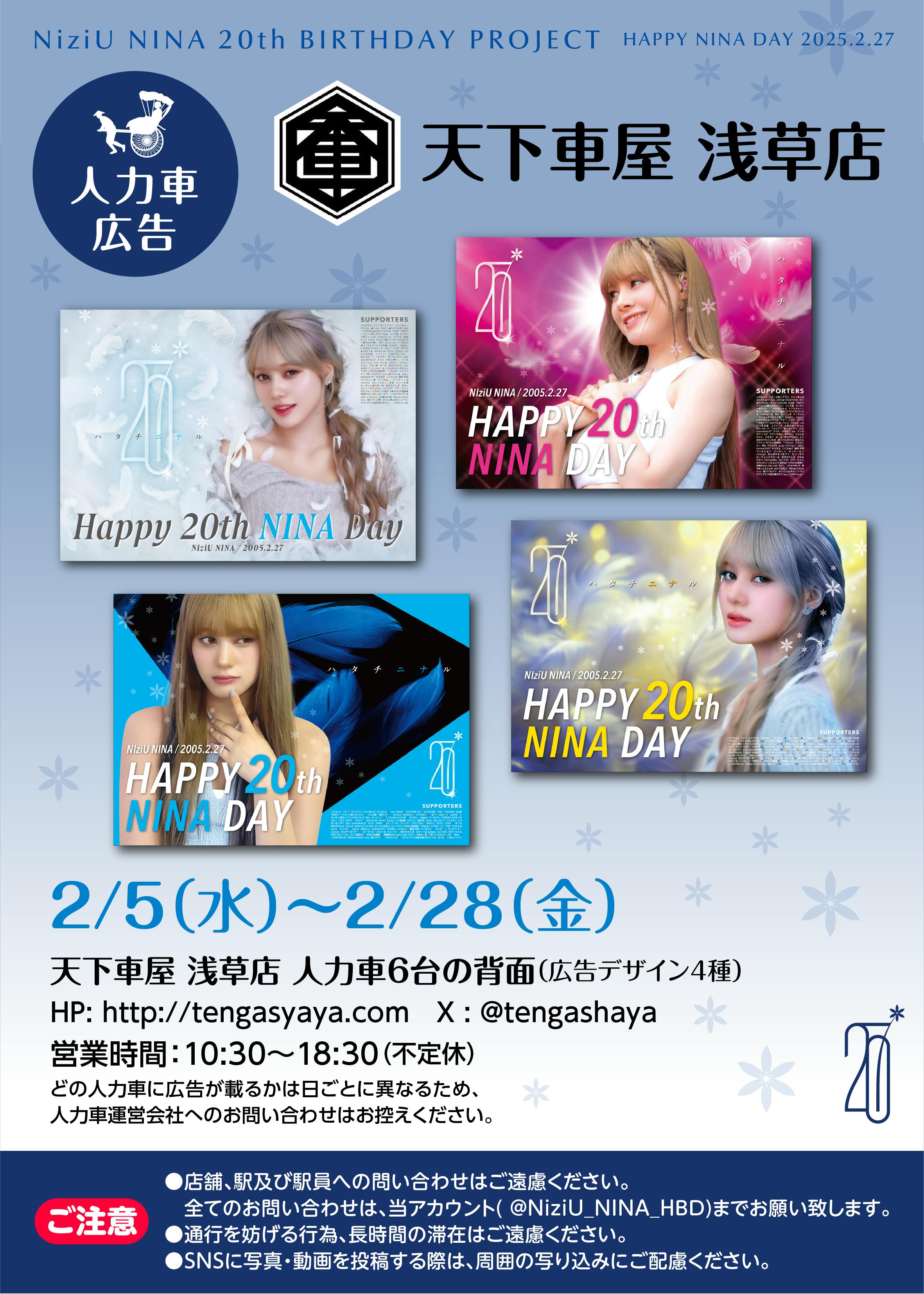 支援者の皆様いつもお世話になっております。ニナ誕生日企画です。本日、2月5日より人力車広告の掲載がスタートしました!!期間:2月5日〜2月28日ハタチになるニナちゃんのお誕生日を祝って、今年は新しく姫路にも掲載!浅草と姫路で合わせて8台のニナ人力車が走っております!今年はぜひ関西の方にも楽しんでいただけたら幸いです。他の広告に関しては順次公開していきます。以上、引き続き何卒よろしくお願いいたします。ニナ誕生日企画