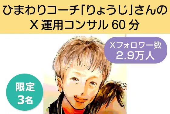わたしのクラウドファンディングをコアメンバーの一人で、日本インフルエンサー連盟ユニラス 認定インフルエンサーのひまわりコーチ「りょうじ」さんご提供のリターンです。Xがご専門のりょうじさんのX運用コンサルをお試しで1回受けることができる権利です。