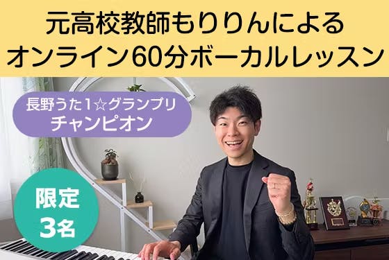 元高校教師で長野県うた1グランプリチャンピオンのもりりんが、あなたの歌声を優しくサポート。オンラインで受けられる60分のパーソナルレッスンで、カラオケでも自信を持って歌えるスキルを身につけましょう!