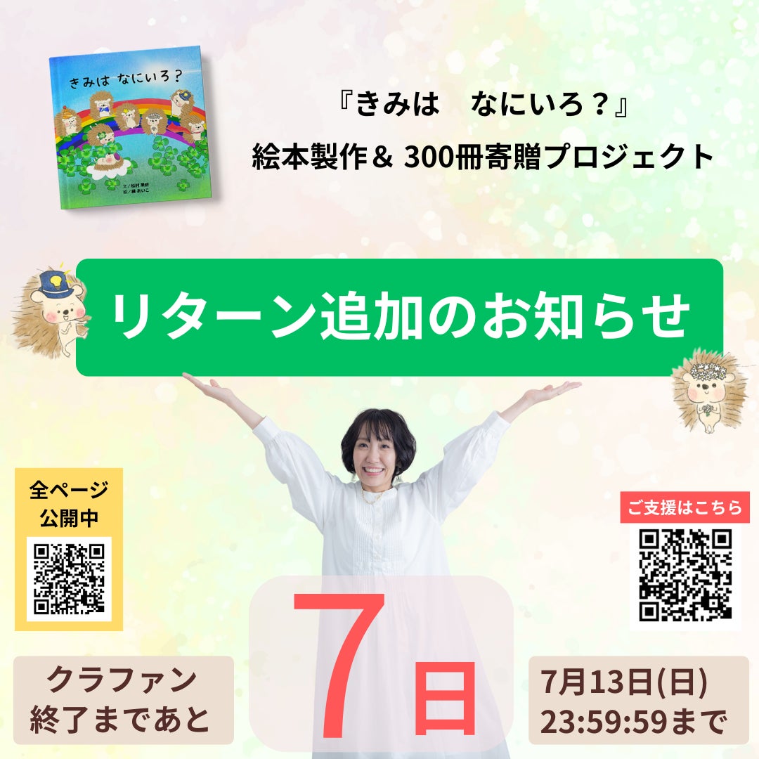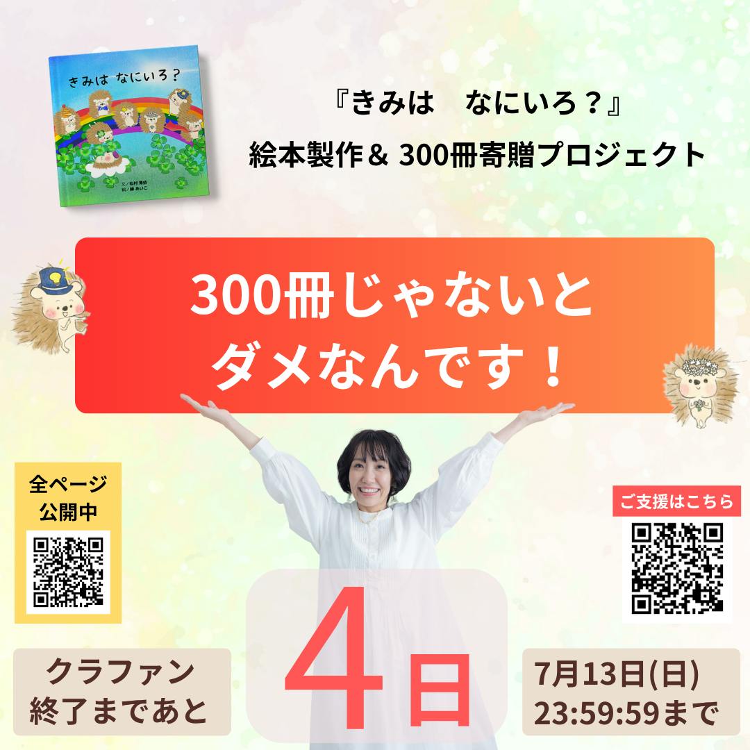 残り3日。68%まで支援をいただきました!ありがとうございます!ライブのお知らせ今日は朝8時から、マリ凛華 さんのオープンチャットでお話させていただきました。このあと14:30からオープンチャットにお招きしてお話を伺います!ご参加お待ちしてます。14:30 オープンチャットライブ 配信先はこちらです7/10のライブの予定 (多少前後する場合があります)--------------------------------12:30 インスタグラムライブ(アーカイブ)配信先はこちら14:30 オープンチャットライブ配信先はこちら20:00 フェイスブック配信先はこちら1人で配信しているので、もしよかったらお立ち寄りください!(インスタとフェイスブックはアーカイブも残ります)--------------------------------おすすめのリターン小さな子どもが身近にいらっしゃらない方におおすすめなリターンをご紹介します!!【残席あと2名】ランチ会リターン場所は東京です。開催日は支援者のみなさんと調整して決めさせていただきます。骨折の状況にもよりますが、8月か9月を予定しています(⇒ 実は骨折していました)日ごろからお世話になっている方にご支援いただき、わたしも楽しみなランチ会です。かなり充実したランチ会になること間違いなしです!ご支援はこちらから福岡で開催したランチ会のようすをご紹介しますWITH THE STYLE FUKUOKA博多駅より7分ほどで行ける素敵なお店でランチ会をしました。ウェディングも行えるホテルの中にあるオープンキッチンのレストラン「WITH THE STYLE FUKUOKA」オンラインでつながっていても、なかなか福岡には来られないので、今回は貴重な機会となりました。ご支援くださった3人の方と近況など、たっぷりとお話できました。カラーボトルをお持ちして色についてもワークショップをさせてもらいました!ご支援いただきましてありがとうございました!東京でのランチ会は残席2名です。是非この機会にご支援よろしくお願いいたします。ご支援はこちらから--------------------------------おすすめリターン絵本『ひかってる?』「きみはなにいろ?」で可愛いハリネズミを描いてくださっている、いのちのお絵かきセラピスト 縁あいこさんから絵本をご提供いただきました。本日も1冊ご支援されまして残り3冊となっています。ご支援はこちらから----「魔法の宝地図・スペシャルイベント」参加チケット8月3日(日)に開催される「魔法の宝地図・スペシャルイベント」の参加券です。葉月小梅さんご提供のリターンです。こども達の夢を叶える第一歩になるイベント間違いなしです!(前回のイベントのレポートはこちら)ご支援はこちらから----よもぎ蒸し40分+ハーブの読み取りご利用券よもぎ蒸しサロンmuguetteのセラピストChiriさんご提供のリターンですご支援はこちらから----写真集「アフターコロナに会いましょう 」白山さんからのメッセージです 写真家小原白山(MiNORU OBARA)が、パンデミック前に出会った世界の子ども達の笑顔を集めた写真集です。 パンデミック中に書いた、再会を誓う手紙を添えた、優しさと癒しの1冊です。 国も時間も宗教も超えて、笑顔に会いに行きましょう。ご支援はこちらから大切なお知らせ--------------------------------絵本の全ページ公開中です ⇒ 詳細はこちら寄贈先を募集中です⇒ 詳細はこちら--------------------------------