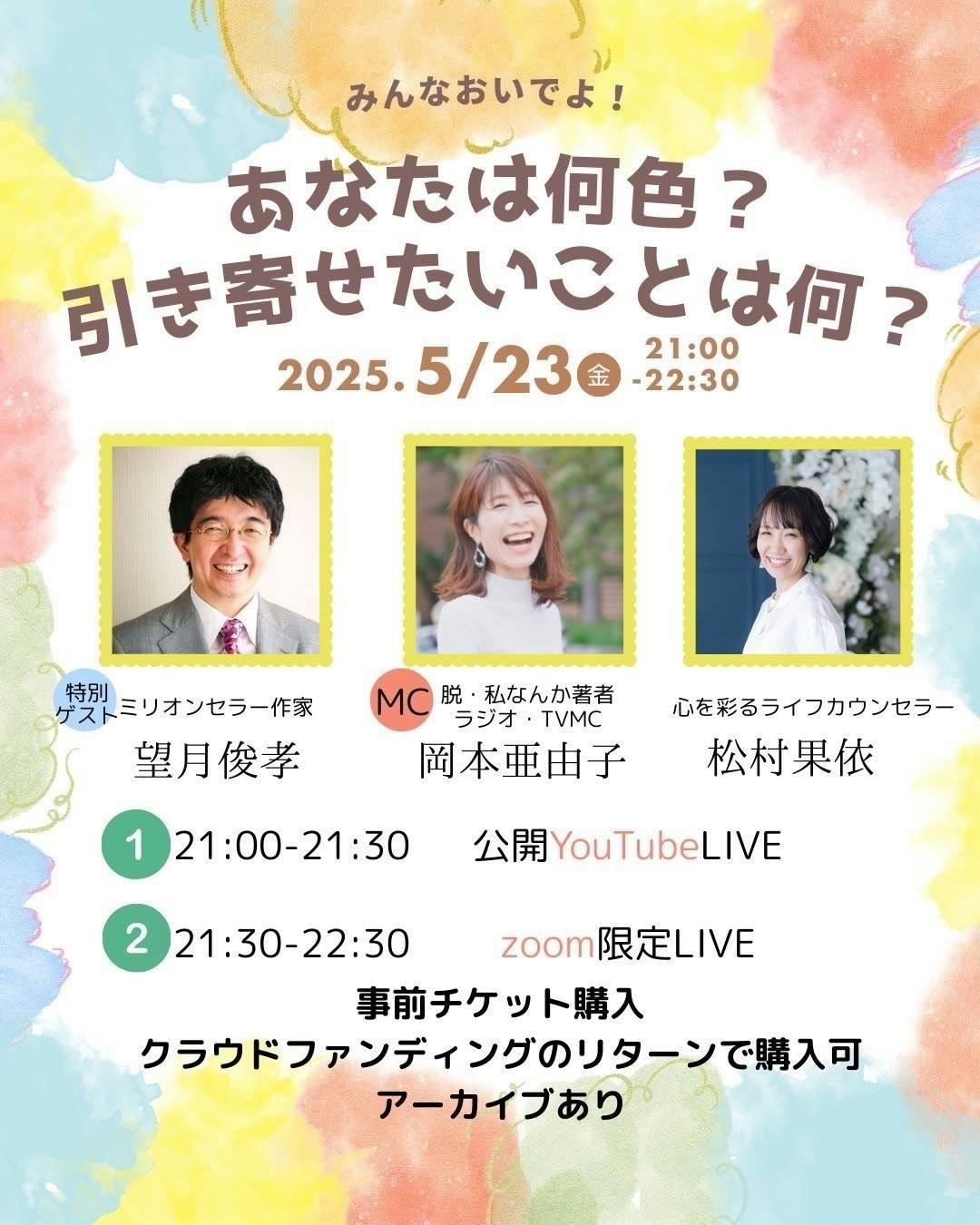 クラウドファンディングが始まって初のオンラインイベントが開催されました!大尊敬しております望月俊孝さん、岡本亜由子さんをお迎えしての夢の共演でした。お二人との出会いが私の生き方を変えてくれました。昨年の出版や様々な挑戦へのきっかけ、後押しになっています。今回は引き寄せと色をメインテーマにお話をしました。岡本亜由子さんの素晴らしいMC、望月俊孝さんの惜しみない皆様への愛が溢れた超有料級なお話もあるスペシャルなお時間となりました。ご支援いただいた皆様、本当にありがとうございました。お時間合わなかった皆様、途中参加だった方、アーカイブをお待ちください。